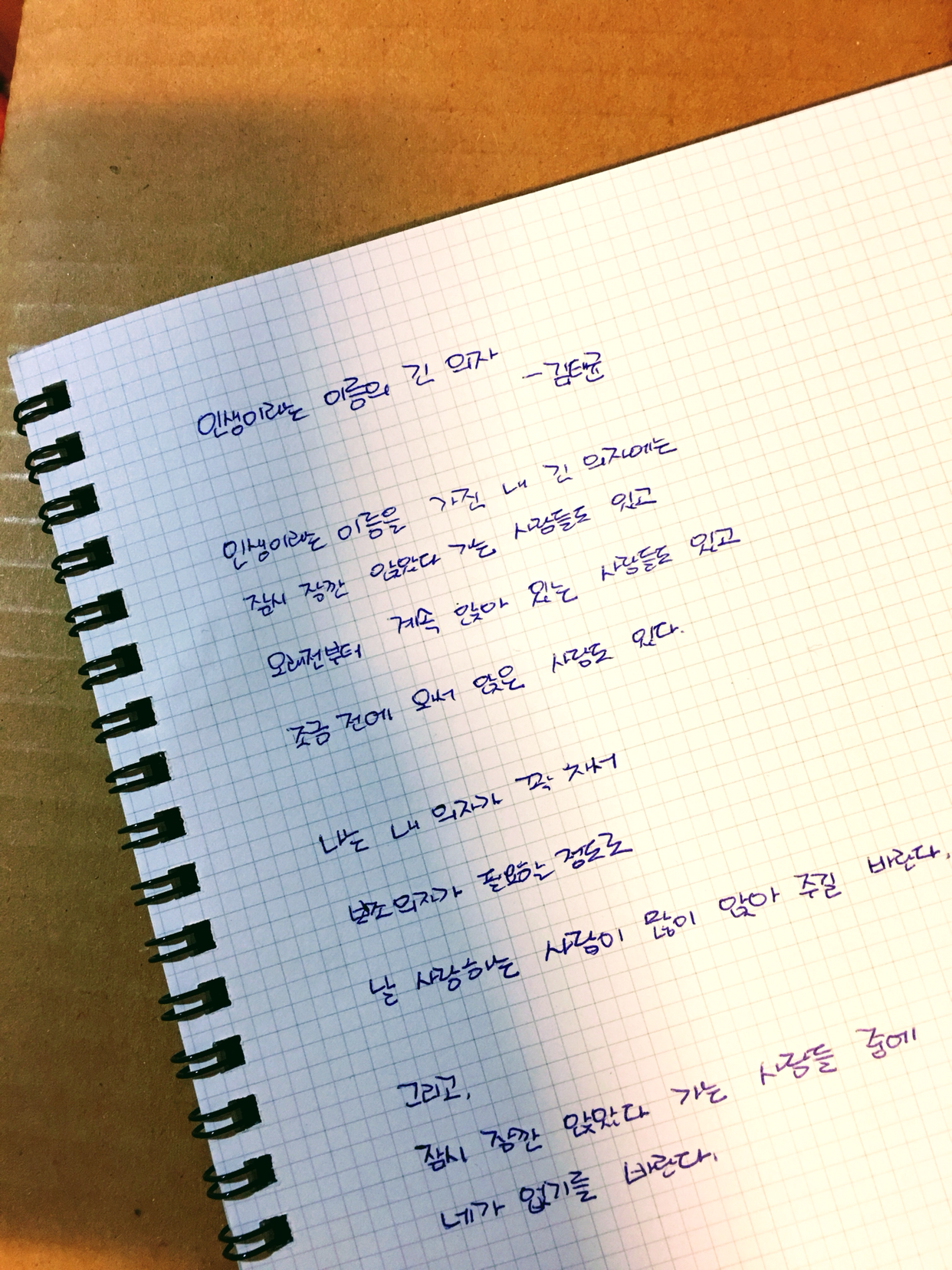 인생이라는 이름의 긴 의자 - 김태균인생이라는 이름을 가진 내 긴 의자에는잠시 잠깐 앉았다 가는 사람들도 있고오래전부터 계속 앉아 있는 사람들도 있고조금 전에 와서 앉은 사람도 있다나는 내 의자가 꽉 차서보조 의자가 필요할 정도로날 사랑하는 사람이 많이 앉아 주길 바란다그리고,잠시 잠깐 앉았다 가는 사람들 중에네가 없기를 바란다