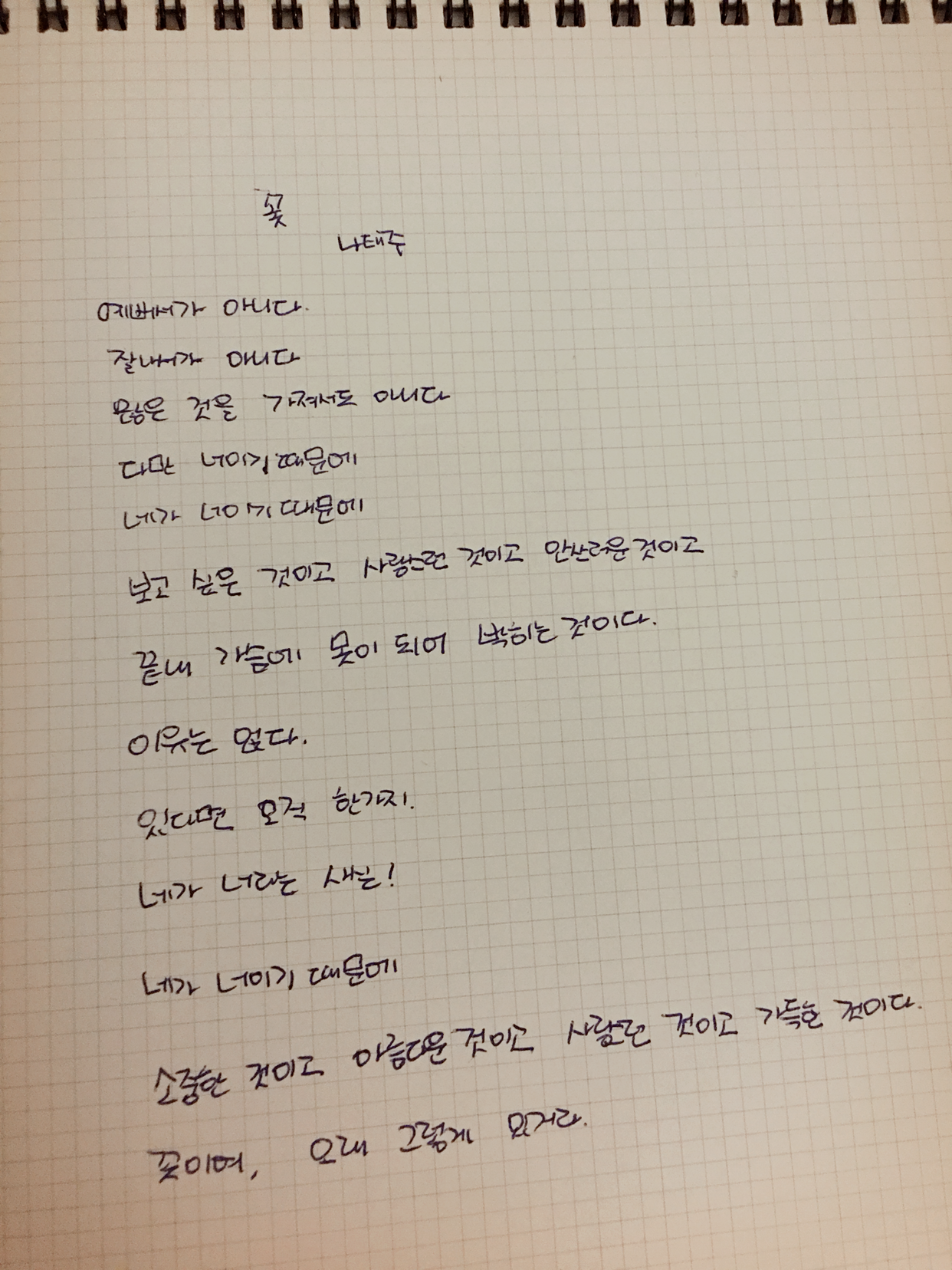 꽃3 - 나태주예뻐서가아니다잘나서가 아니다많은 것을 가져서도 아니다다만 너이기 때문에네가 너이기 때문에보고 싶은 것이고 사랑스런 것이고 안쓰러운 것이고끝내 가슴에 못이 되어 박히는 것이다이유는 없다있다면 오직 한 가지 네가 너라는 사실!네가 너이기 때문에소중한 것이고 아름다운 것이고 사랑스런 것이고 가득한 것이다꽃이여, 오래 그렇게 있거라.