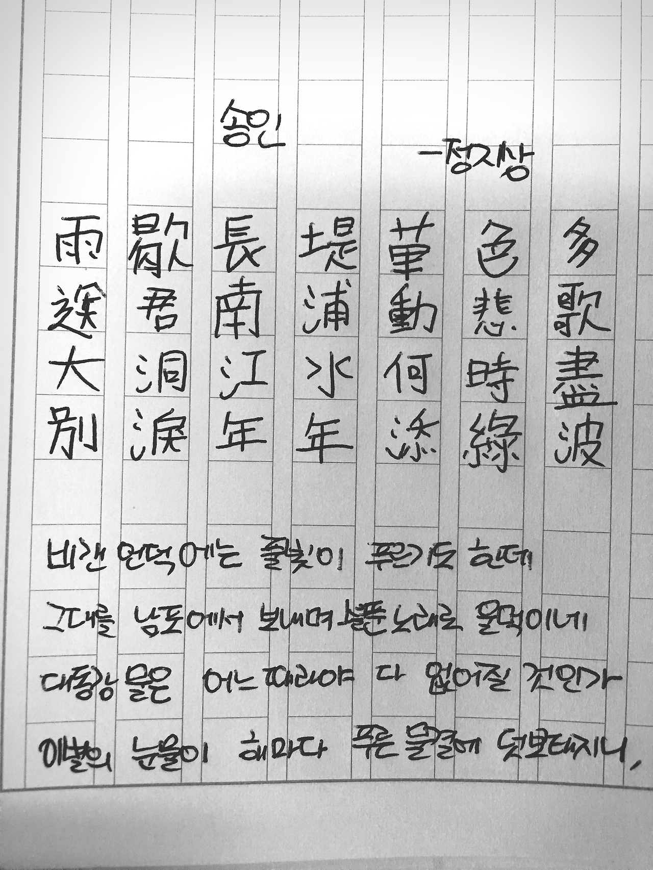 [0727] #057 송인 - 정지상 雨歇長堤草色多送君南浦動悲歌大同江水何時盡別淚年年添錄波비 갠 긴 언덕에는 풀빛이 푸르기도 한데그대를 남포에서 보내며 슬픈 노래로 울먹이네.대동강 물은 어느 때라야 다 없어질 것인가 이별의 눈물이 해마다 푸른 물결에 덧보태지니.