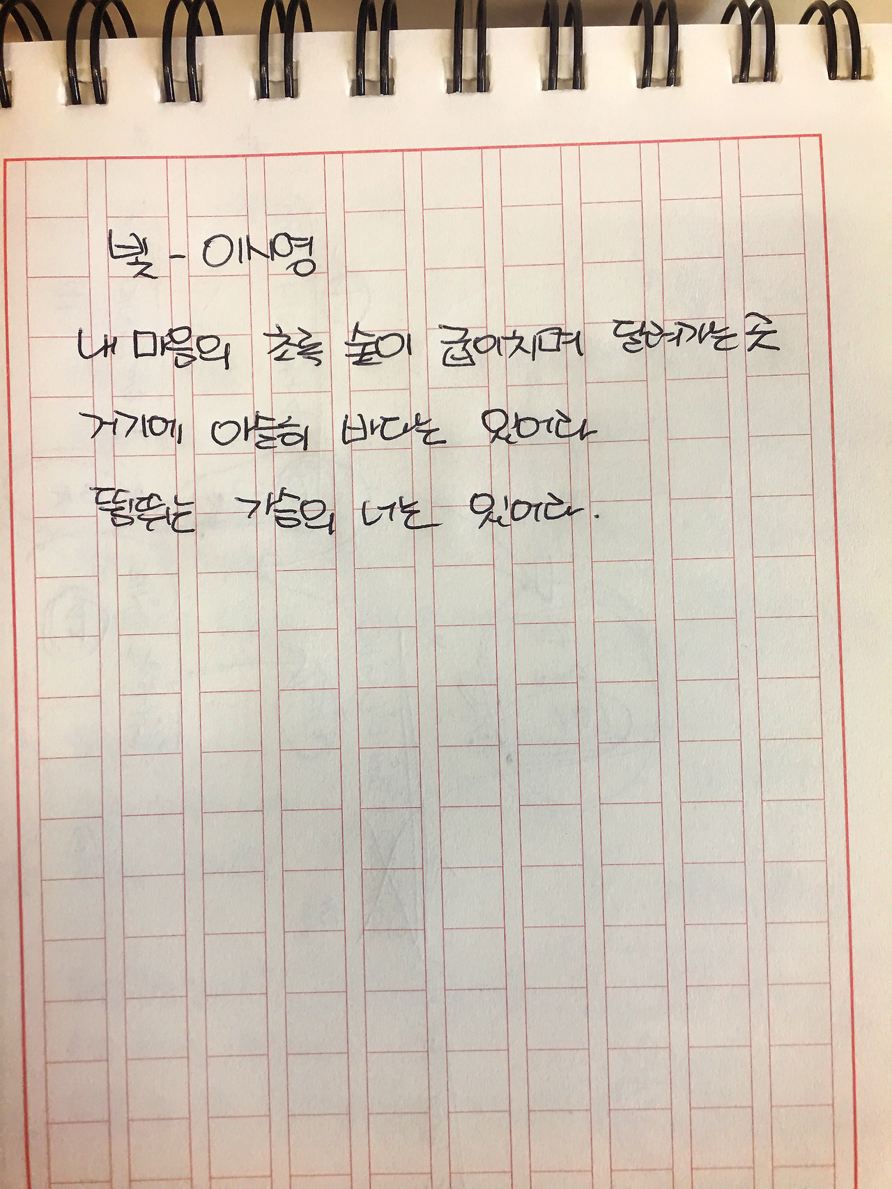 [0808] #069 빛 by 이시영 내 마음의 초록 숲이 굽이치며 달려가는 곳거기에 아슬히 바다는 있어라뜀뛰는 가슴의 너는 있어라#1일1시 #100lab