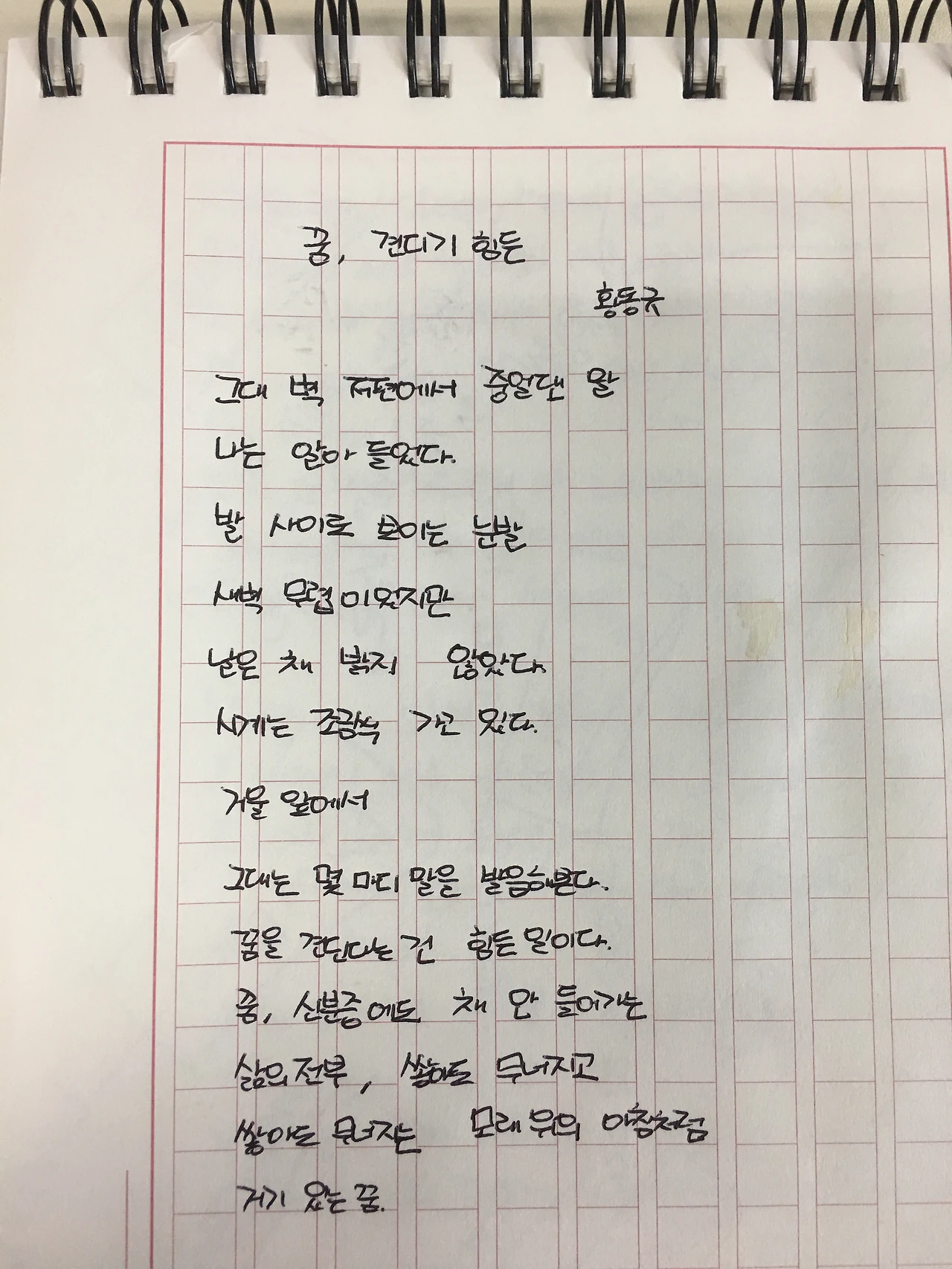 [0828] #089 꿈, 견디기 힘든 by 황동규그대 벽 저편에서 중얼댄 말나는 알아 들었다발 사이로 보이는 눈발새벽 무렵이었지만날은 채 밝지 않았다시계는 조금씩 가고 있다거울 앞에서그대는 몇마디 말을 발음해본다꿈을 견딘다는 건 힘든 일이다꿈, 신분증에도 채 안 들어가는삶의 전부, 쌓아도 무너지고쌓아도 무너지는 모래 위의 아침처럼거기 있는 꿈#1일1시 #100lab
