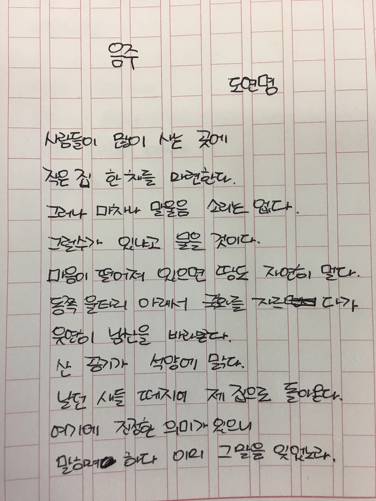 [0905] 음주 by.도연명 사람들이 많이 사는 곳에작은 집 한 채를 마련한다그러나 마차나 말울음 소리는 없다그럴 수가 있냐고 물을 것이다마음이 떨어져 있으면 땅도 자연히 멀다동쪽 울타리 아래서 국화를 자르다가유연히 남산을 바라본다산 공기가 석양에 맑다날던 새들 떼지어 제 집으로 돌아온다여기에 진정한 의미가 있느니말하려 하다 이미 그 말을 잊었노라