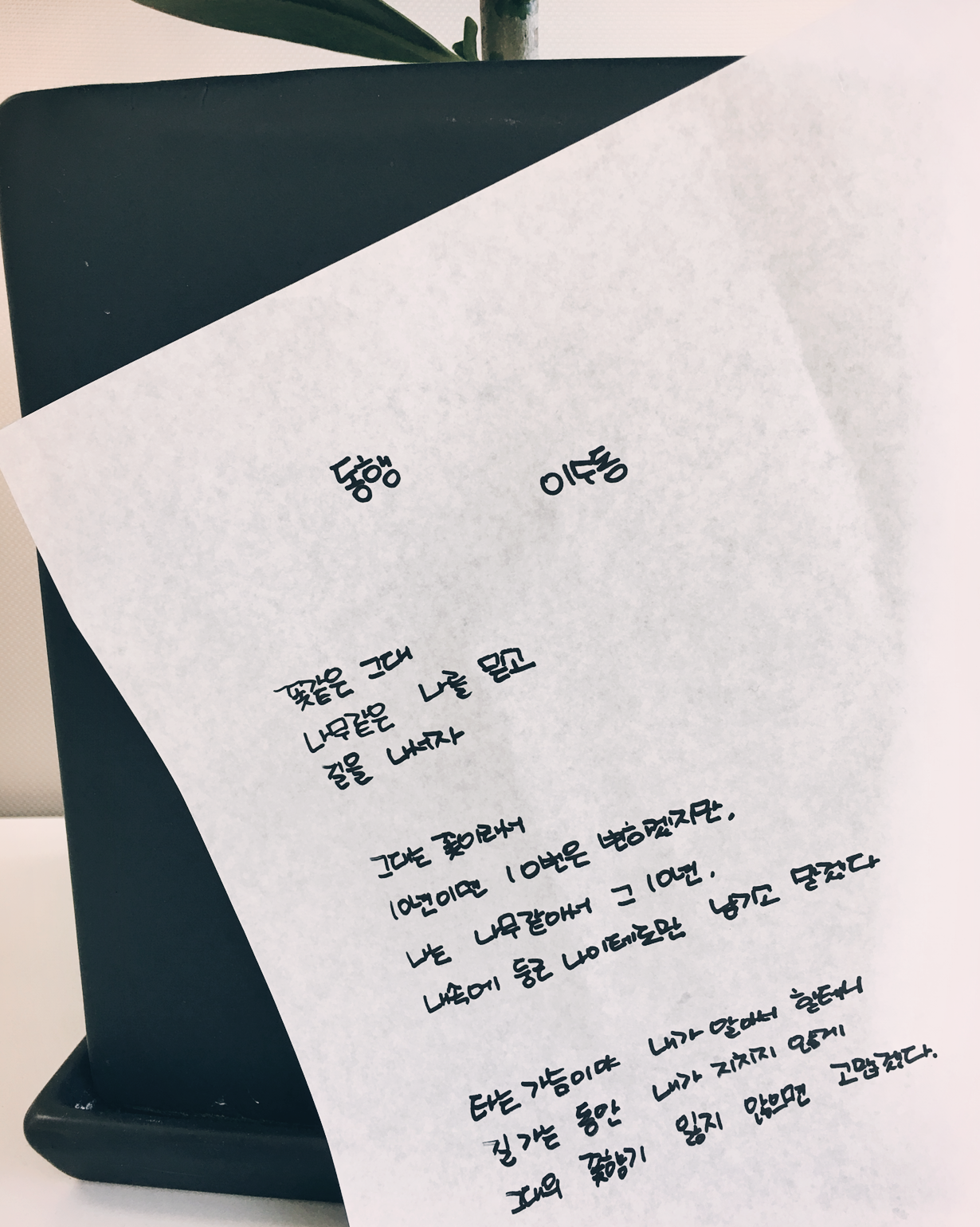 동행 - 이수동꽃같은 그대나무같은 나를 믿고길을 나서자그대는 꽃이라서 10년이면 10번은 변하겠지만나는 나무같아서 그 10년,내 속에 둥근 나이테로만 남기고 말겠다타는 가슴이야 내가 알아서 할테니길 가는 동안 내가 지치지 않게그대의 꽃향기 잃지 않으면 고맙겠다#1일1시 #100lab