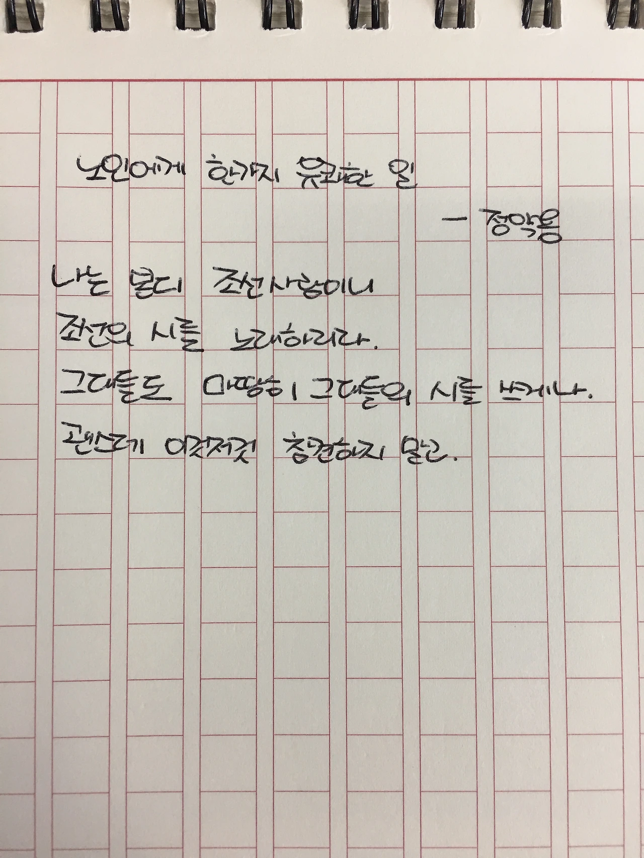 노인에게 한 가지 유쾌한 일 - 정약용나는 본디 조선 사람이니조선의 시를 노래하리라.그대들도 마땅히 그대들의 시를 쓰게나.괜스레 이것저것 참견하지 말고
