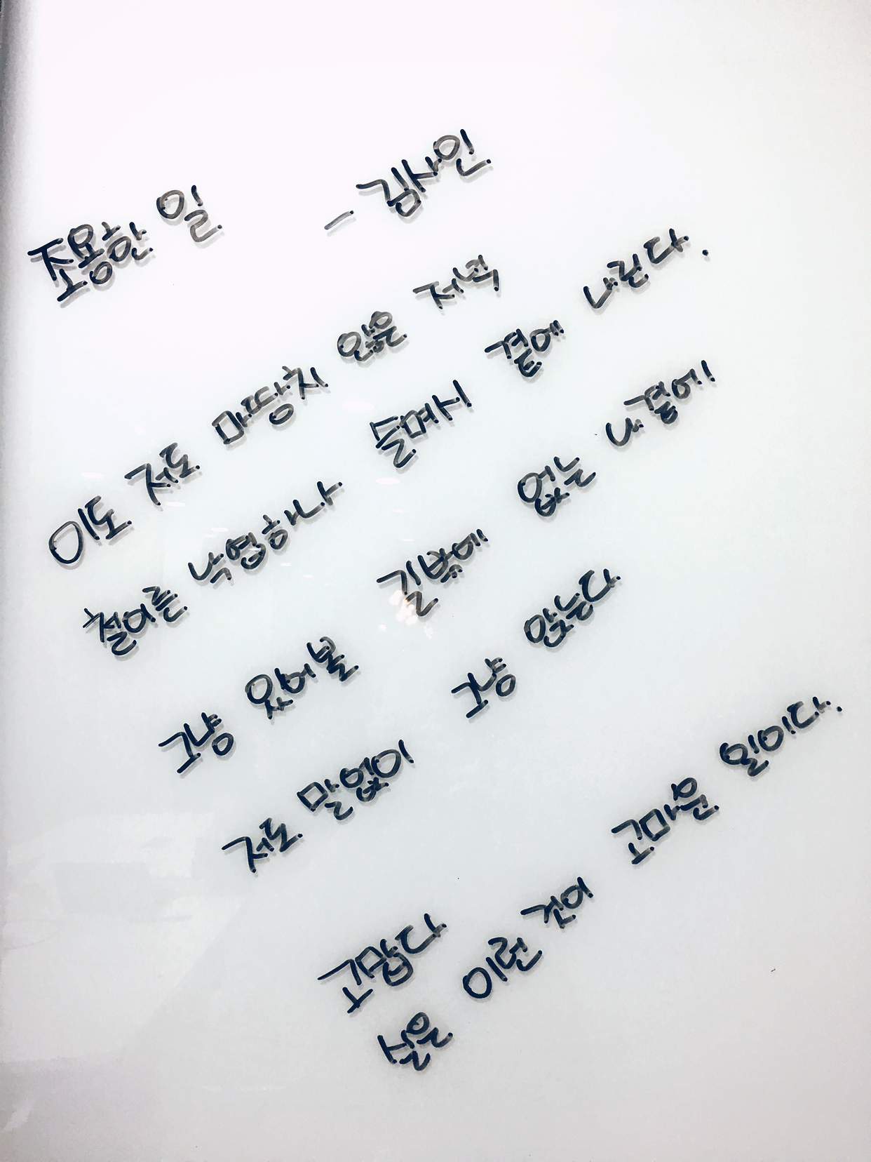 조용한 일 - 김사인이도 저도 마땅치 않은 저녁철이른 낙엽하나 슬며시 곁에 내린다 그냥 있어볼 길밖에 없는 내 곁에저도 말없이 그냥 앉는다 고맙다실은 이런 것이 고마운 일이다#1일1시#100lab