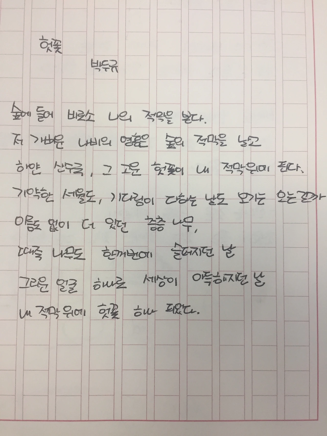 [1025] 헛꽃 by 박두규숲에 들어 비로소 나의 적막을 본다저 가벼운 나비의 영혼은 숲의 적막을 날고하얀 산수국, 그 고운 헛꽃이 내 적막 위에 핀다기약한 세월도, 기다림이 다하는 날도 오기는 오는 걸까이름도 없이 더 있던 층층나무, 때죽나무도 한꺼번에 슬퍼지던 날그리운 얼굴 하나로 세상이 아득해지던 날내 적막 위에 헛꽃 하나 피었다