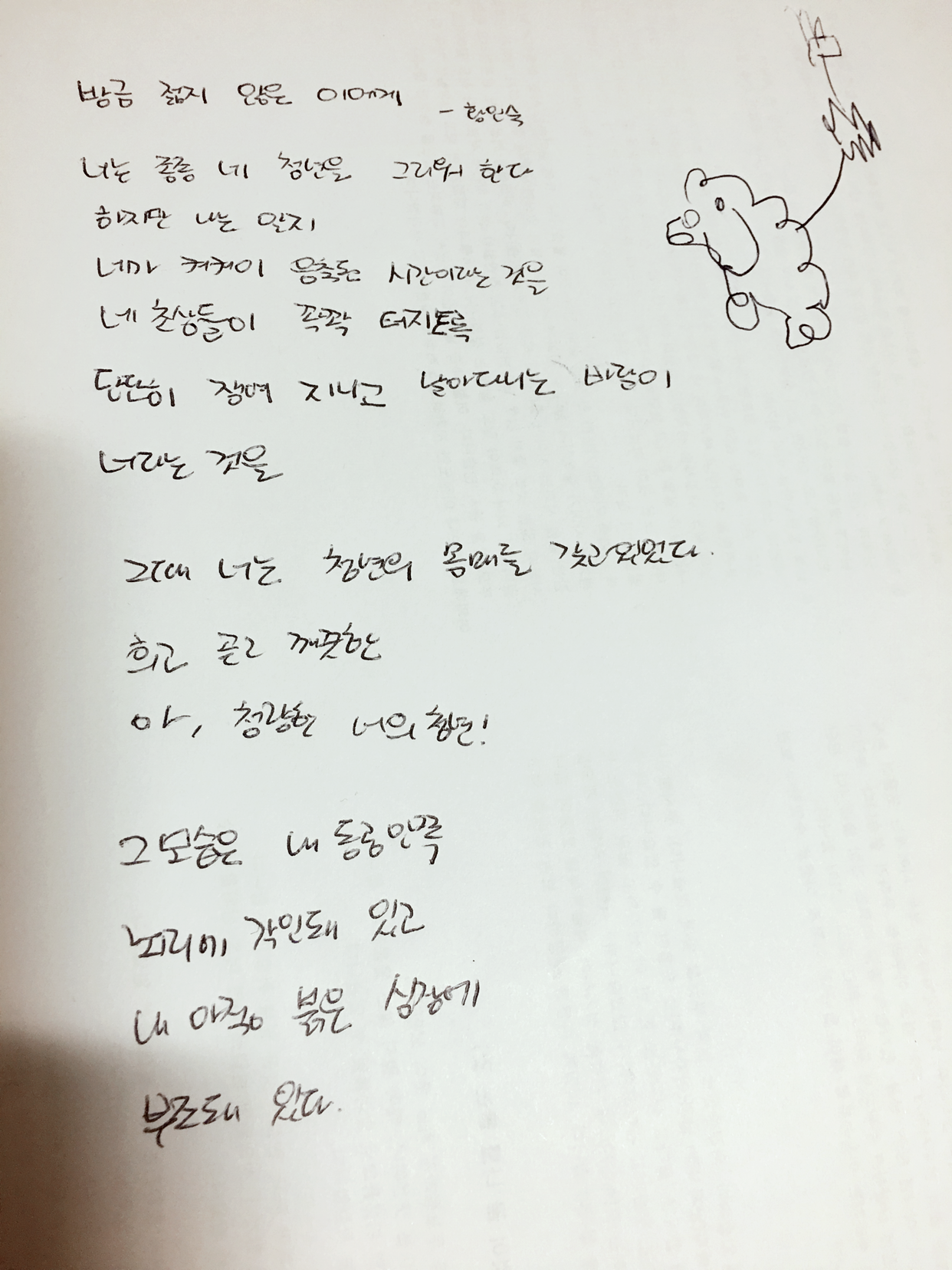 너는 종종 네 청년을 그리워한다하지만 나는 알지네가 켜켜이 응축된 시간이라는 것을네 초상들이 꽉꽉 터지도록단단히 쟁여 지니고 날아다니는 바람이너라는 것을 그때 너는 청년의 몸매를 갖고 있었다희고 곧고 깨끗한아, 청량한 너의 청년! 그 모습은 내 동공 안쪽뇌리에 각인돼 있고내 아직 붉은 심장에부조돼 있다.#1일1시#100lab