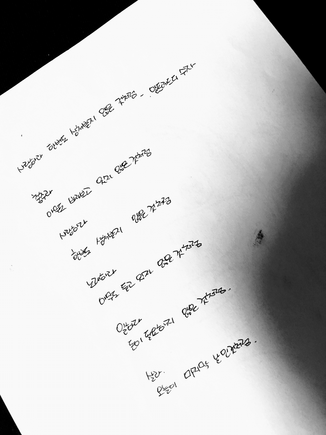 [0310]52_사랑하라, 한번도 상처받지 않은 것처럼 by 알프레드 디 수자춤추라, 아무도 바라보고 있지 않은 것처럼.사랑하라, 한번도 상처받지 않은 것처럼.노래하라, 아무도 듣고 있지 않은 것처럼.일하라, 돈이 필요하지 않은 것처럼.살라, 오늘이 마지막 날인 것처럼.