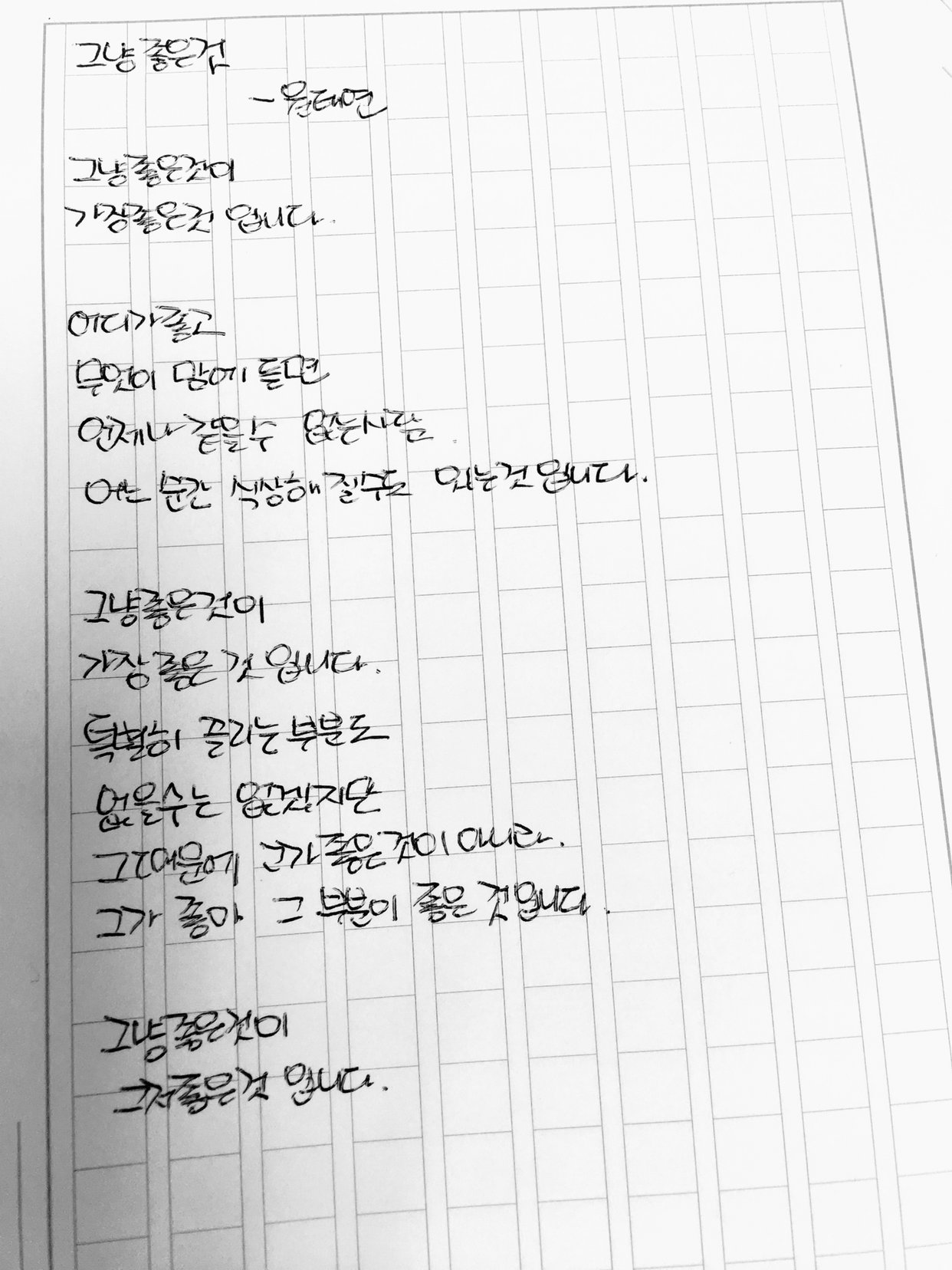 [0316] 058_그냥좋은것 by. 원태연그냥 좋은 것이가장 좋은 것입니다어디가 좋고무엇이 마음에 들면,언제나 같을 수는 없는 사람어느 순간 식상해질 수도 있는 것입니다그냥 좋은 것이가장 좋은 것입니다특별히 끌리는 부분도없을 수는 없겠지만그 때문에 그가 좋은 것이 아니라그가 좋아 그 부분이 좋은 것입니다그냥 좋은 것이그저 좋은 것입니다