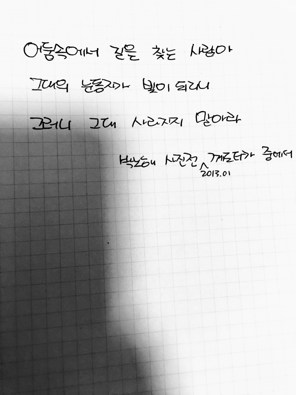 [0324]066_어둠속에서 길을 찾는 사람아 by 박노해 어둠속에서 길을 찾는 사람아그대의 눈동자가 빛이 되리니그러니 그대 사라지지 말아라 박노해 사진전 2013.01 께로디카 中#1일1시 #100lab