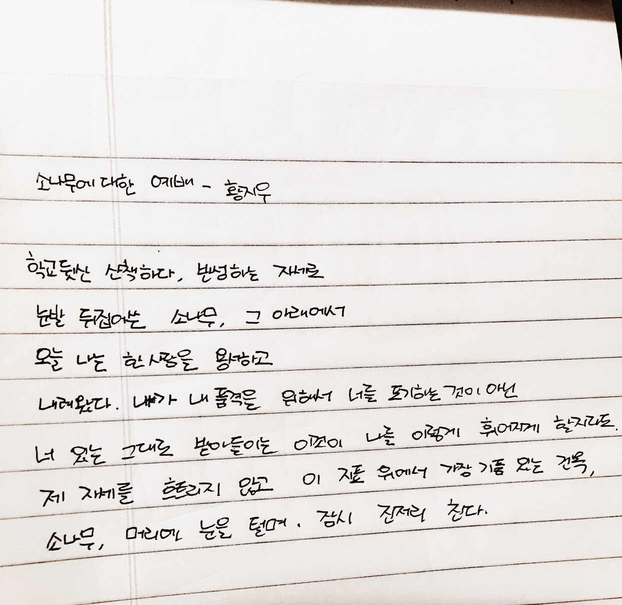 [0401] 074_소나무에 대한 예배 _황지우학교 뒷산 산책하다, 반성하는 자세로,눈발 뒤집어쓴 소나무, 그 아래에서오늘 나는 한 사람을 용서하고내려왔다. 내가 내 품격을 위해서너를 포기하는 것이 아닌,너 있는 그대로 받아들이는 이것이나를 이렇게 휘어지게 할지라도.제 자세를 흐트리지 않고이 지표 위에서 가장 기품 있는건목; 소나무, 머리에 눈을 털며잠시 진저리친다.