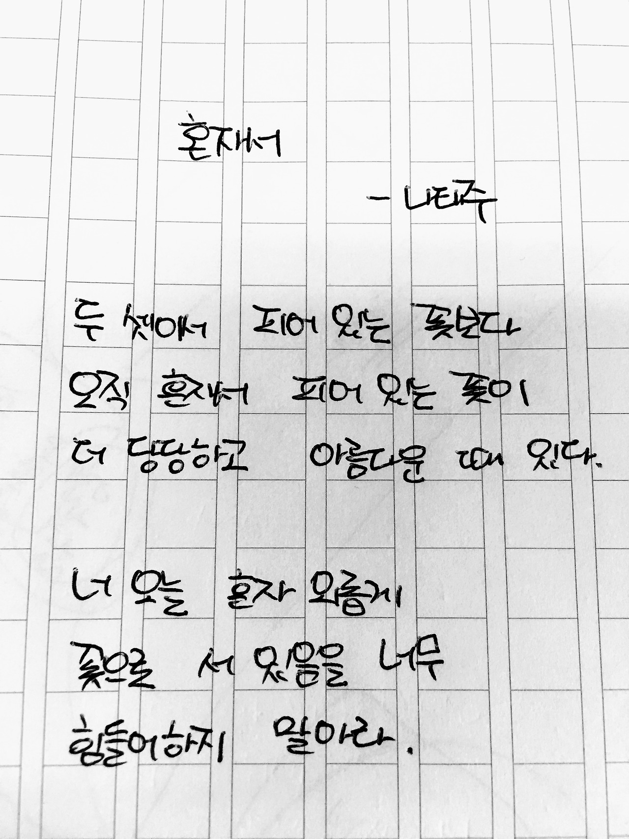 [0409] 082_혼자서 by 나태주 두 셋이서 피어 있는 꽃보다오직 혼자서 피어있는 꽃이더 당당하고 아름다울 때 있다 너 오늘 혼자 외롭게꽃으로 서 있음을 너무힘들어 하지 말아라#1일1시 #100lab