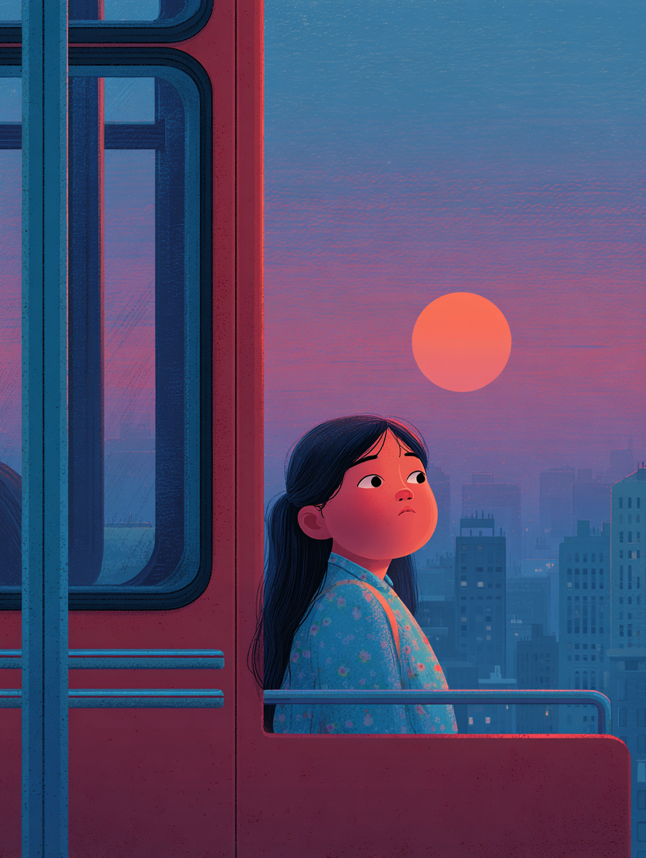 창밖에 해가 뜨고 버스 달리는 소리가 크게 들려온다.