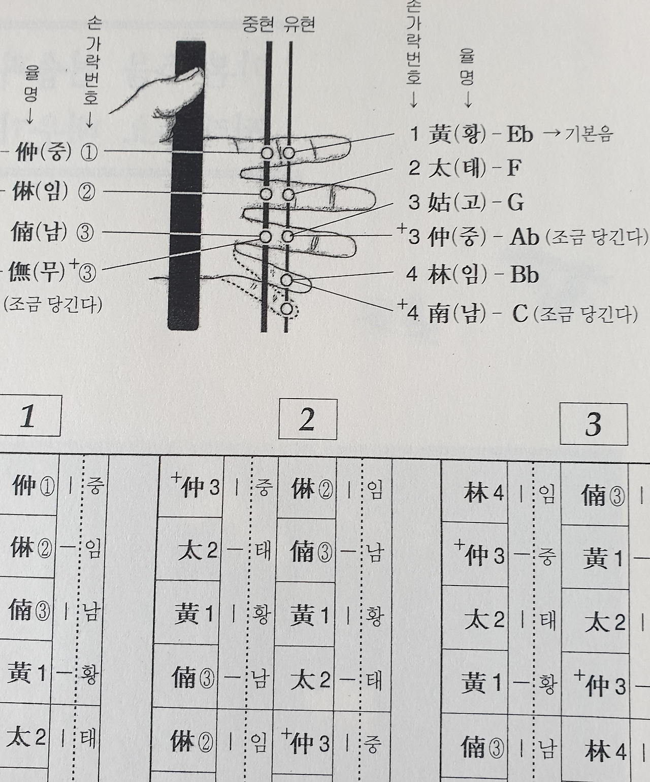 해금을 배우는데 큰 장애물이 하나 있다. 바로 악보다. 해금 악보는 우리가 아는 악보와 전혀 다르다. 정사각형 칸에 한자가 세로로 쓰여 있다. 이를 ‘정간보’(우물 정(井) 모양 안에 음의 높이를 나타내는 율명을 기보)라고 한다. 음의 이름도 다르다. '도레미파솔라시'도 아니고 어릴 때 학교 음악시간에 배운 ‘궁상각치우’도 아니다. ‘중임남무황태고’의 반복. 반음은 이름이 또 다르다. 음의 높낮이에 따라 한자도 다르다. 같은 ‘중’이어도 높은 중은 仲을 쓰고 낮은 중은 㑖을 쓴다.