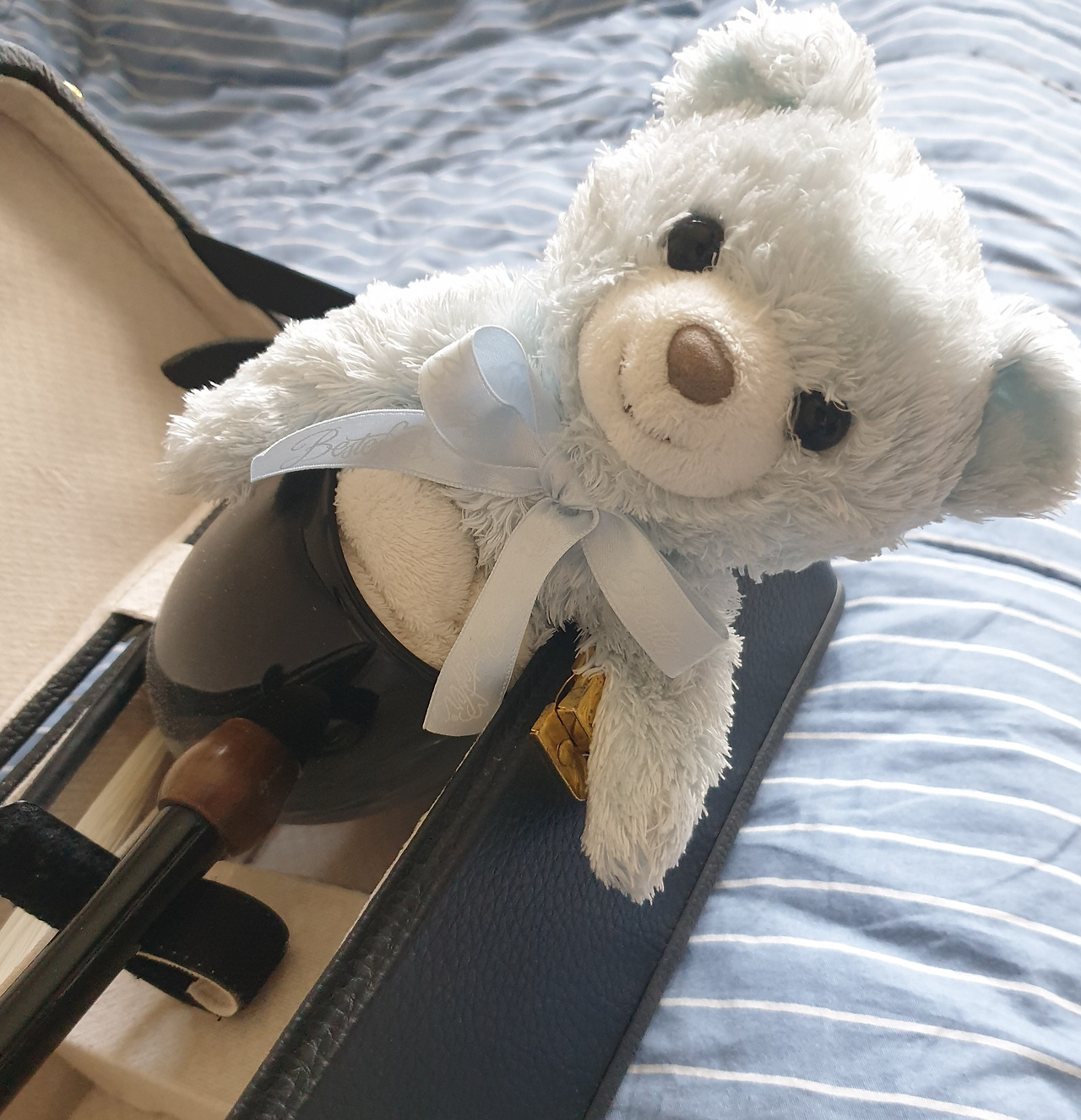 하루에 30분씩이라도 매일 연습하자 생각했는데 집에서 연습하기가 쉽지 않다. 집에서 가장 중앙에 위치한 방으로 들어가 방문, 창문을 모두 닫아야 하고 그것도 모자라 울림통에 헝겊을 끼워서 최대한 소리를 줄여야 한다. 그래도 크다. 연습할 때마다 이웃집에 피해가 갈까 봐 신경이 쓰인다. 울림통에 무엇을 끼울까 이것저것 생각하다가 작은 곰 인형을 끼워봤다. 엉덩이부터 밀어 넣으니 상체만 남기고 다리까지 쏙 들어간다.