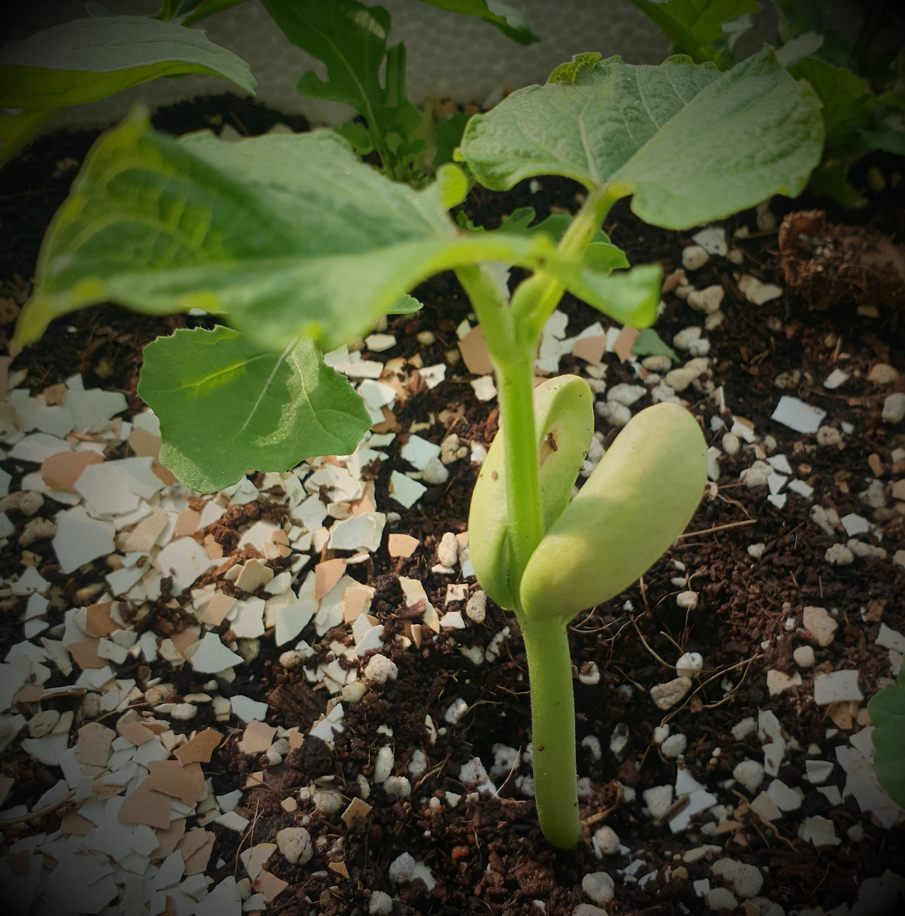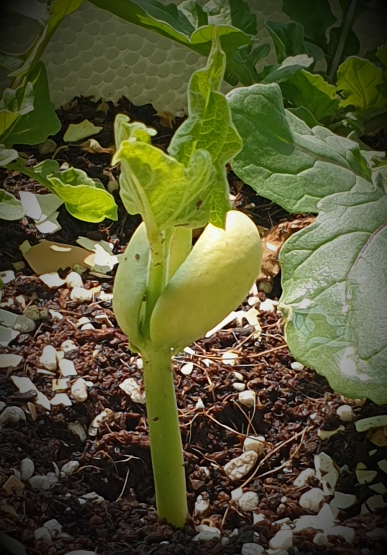 어느 날 아침 흙이 들썩거린 것이 보였다. 여태껏 보지 못한 모습이다. 루꼴라, 바질, 고수처럼 여린 새싹의 형태가 아니었다. 응? 저건 뭘까?.... 앗! 호랑이 콩이다!!