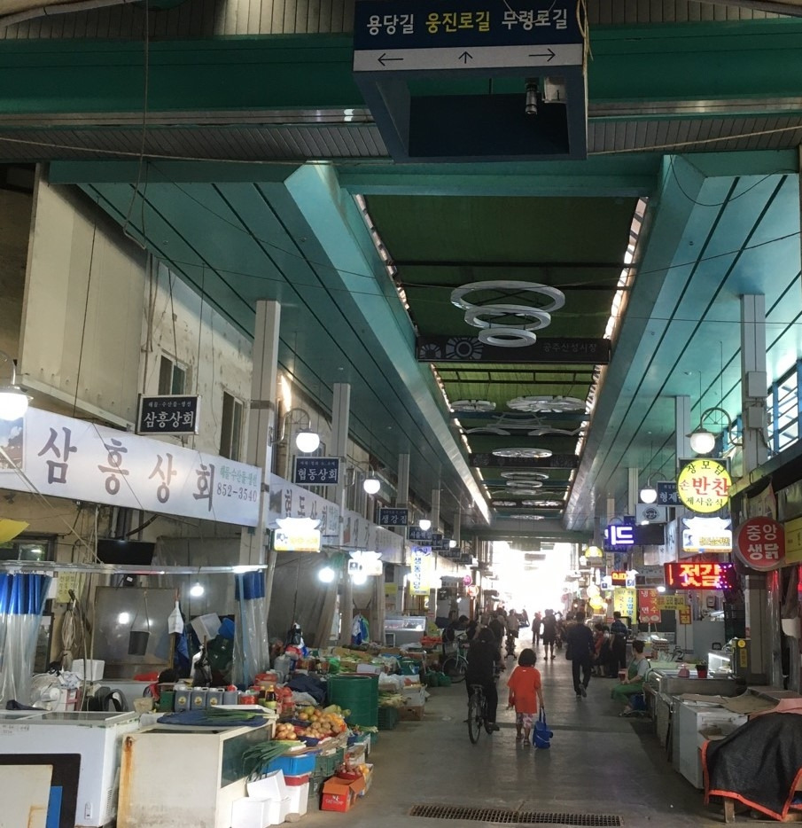 유통 규모로 보자면 배 이상이다. 장날이면 어김없이 상설시장 안쪽 통로를 따라 좌판들이 끝도 없이 들어서기 때문이다. 나물이며 채소들을 조랑조랑 펼쳐 놓고 자리 잡은 할머니들은 다들 어디서 오셨는지. 물건을 펼쳐놓고 앉아계시는 어르신들도 많지만 파는 물건도 가지가지다. 올망졸망 알감자에 아직도 싱싱한 꽃이 붙어있는 오이, 소복한 흰 꽃이 함빡 피어있는 대파와 금방 밭으로 달려갈 것 같이 싱싱한 상추며 고추에 호박에, 이름을 다 알 수 없는 나물 천지다. 작년에 다녀간 채식주의자 큰 조카 녀석은 이곳을 두고 베지테리언의 성지라며 좋아라 했다.