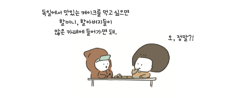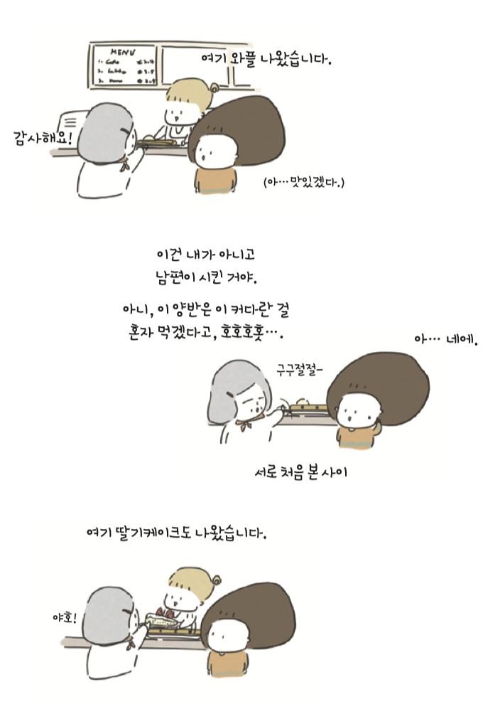 손글씨로 정성스레 써 있는 메뉴들을 훑어보며 한참 기다리고 있는데, 바로 앞에 서 있던 할머니가 먹음직스러운 와플을 받아 들고는 돌아보며 나에게 말했다.