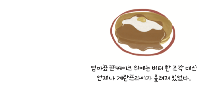 그러고 보니 와플은 내가 어른이 되고 나서야 비로소 멋진 인테리어의 카페에 앉아 꽤 비싼 돈을 지불하고 먹은 디저트였다. 사실 와플보다 나에게 생각만 해도 군침이 돌고 미소를 머금게 하는 디저트는 바로 팬케이크이다. 어렸을 때 엄마가 프라이팬에 만들어주곤 했던, 계란 반숙을 살포시 올린 이단짜리 납작하고 폭신한 팬케이크. 다 구워지기가 무섭게 얼른 접시에 받아 들고는 이미 동그란 빵을 달처럼 노랗게 물들이고 있는 계란과 함께 적당히 잘라 포크로 한입에 쏙 넣는다. 그럴 때면 입안 가득 퍼지던 달콤한 버터와 메이플 시럽의 향, 그리고 맛의 균형을 잡아주던 고소한 계란 프라이의 맛까지 그야말로 순식간에 행복하게 물들인 어린 시절 최고의 디저트였다. 엄마표 팬케이크의 맛은 마치 어제도 맛본 듯 생생하다.