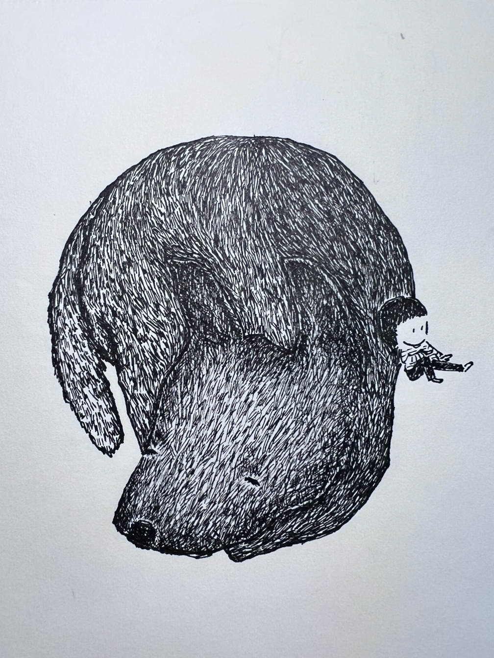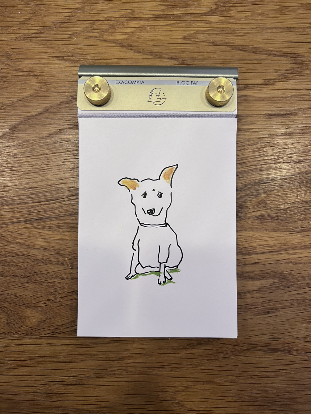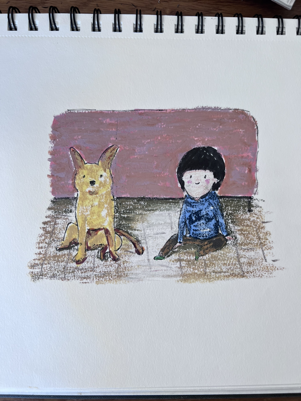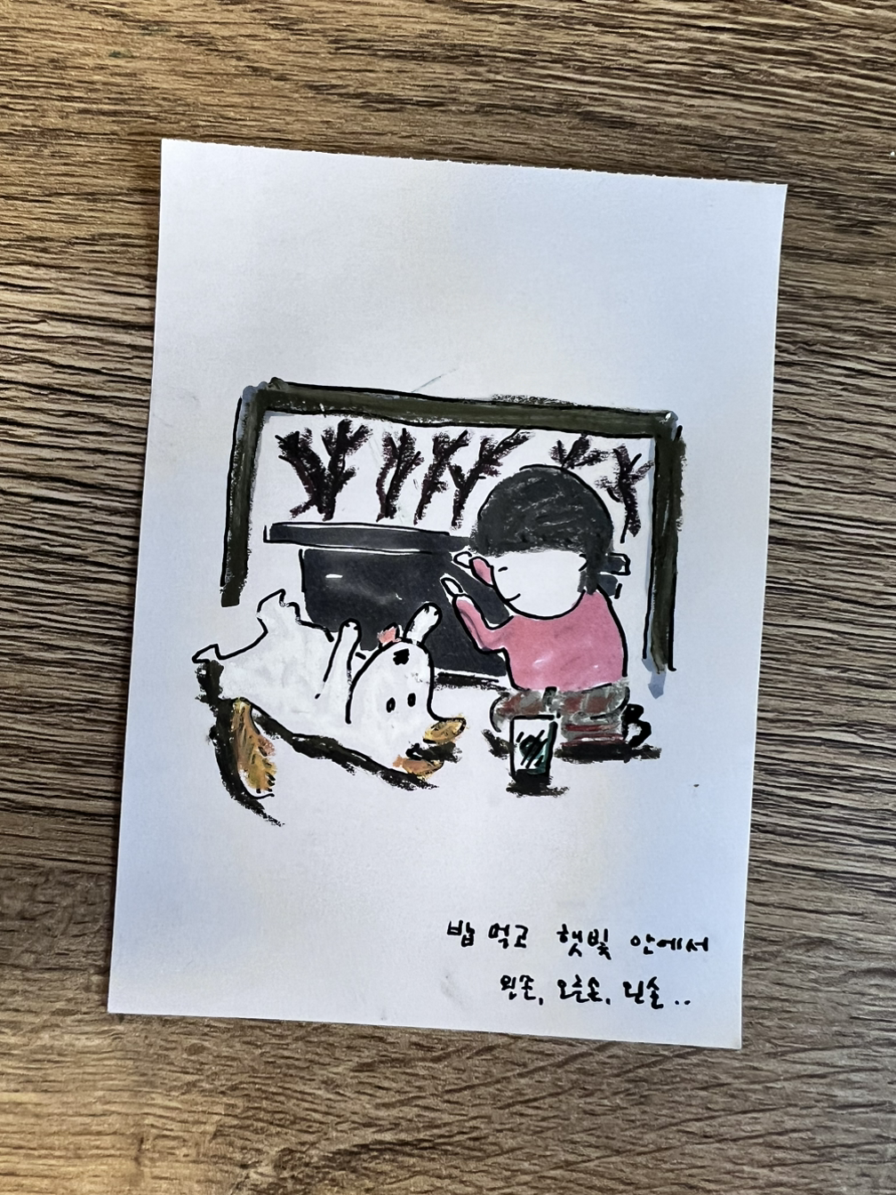 손으로 종이에다 그림을 그리는 게 참 어려웠다. 태블릿이나 아이패드로 슥슥 그리는 게 익숙해져서 그런 것 같기도 하다. 단번에 되돌아가기, 새로 고침을 할 수 없다는 것 때문에 애써온 걸 망쳐버릴지도 모른단 두려움이 항상 있었다. 2023년 새해에 어떤 마감모임에 참여하게 되었는데 각자 실천하고자 하는 목표를 난 [매일 손그림]으로 정했다. 그렇게 하루에 하나씩 그려나가기 시작했다. 꾸준히 계속하기 위해선 내가 관심 있고 좋아하는 걸 해야 한다. 난 한국에서 독일로 입양해서 함께 한 지 1년이 조금 넘은 반려견 누리의 표정과 앉아있는 자세, 누워있는 모습 등을 관찰하고 그려나갔다. 처음엔 색칠할 여유도 없이 조심조심 선 하나씩을 그렸다. 그러다 그림이 하나씩 쌓여가면서, 조금 어설프고 의도에서 벗어나버린 손그림들이 좋아졌다. 평소 쓰지 않는 과감한 색상으로 덧칠하기도 하고 미리 연필로 밑그림을 그리지 않고 곧장 펜으로 그리기도 했다.