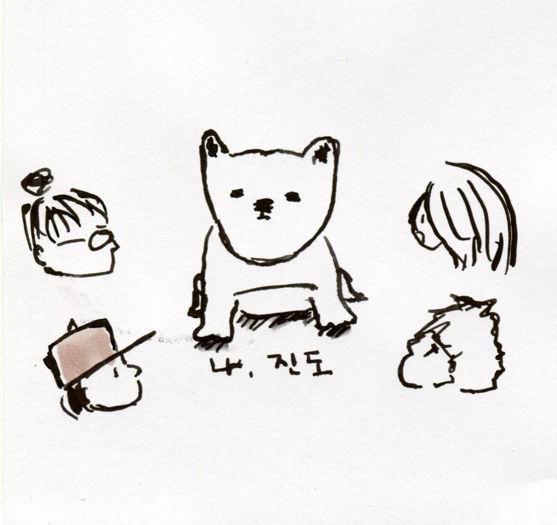 다음 날 아침 누리와 공원에 가기 위해 나왔는데 지나가던 차가 갑자기 우리 앞에 멈추더니 어떤 할아버지가 창문을 내린 후 잔뜩 굳은 표정으로 어제 일어났던 일에 대해 말하기 시작했다. 조금 당황했지만 이건 누가 뭐래도 우리의 잘못이 맞고 게다가 어제 충분히 대화를 나누지 못했던 게 생각났다. 그렇게 시작된 주절주절 사죄의 시간. 난 정말 미안하다고 몇 번이나 말하며 허공에 정처 없이 맴도는 손을 가슴에 댔다가 양손을 모으기도 했다가 난리도 아니었다. 결국 표정이 한결 누그러진 할아버지는 그럴 수도 있지 뭐 하고 웃으며 차를 몰고 집으로 향했다. 다시 걷기 시작하는데 갑자기 든 생각. 엇 그런데 어떻게 우릴 알아봤지 어제 할아버지는 없었는데. 아, 맞다. 우리가 이 동네에서 유일무이한 아시안인 걸 깜빡했네. 사실 한국에서 흔하디 흔한 진도믹스도 여기선 굉장히 유니크한 개일테고.