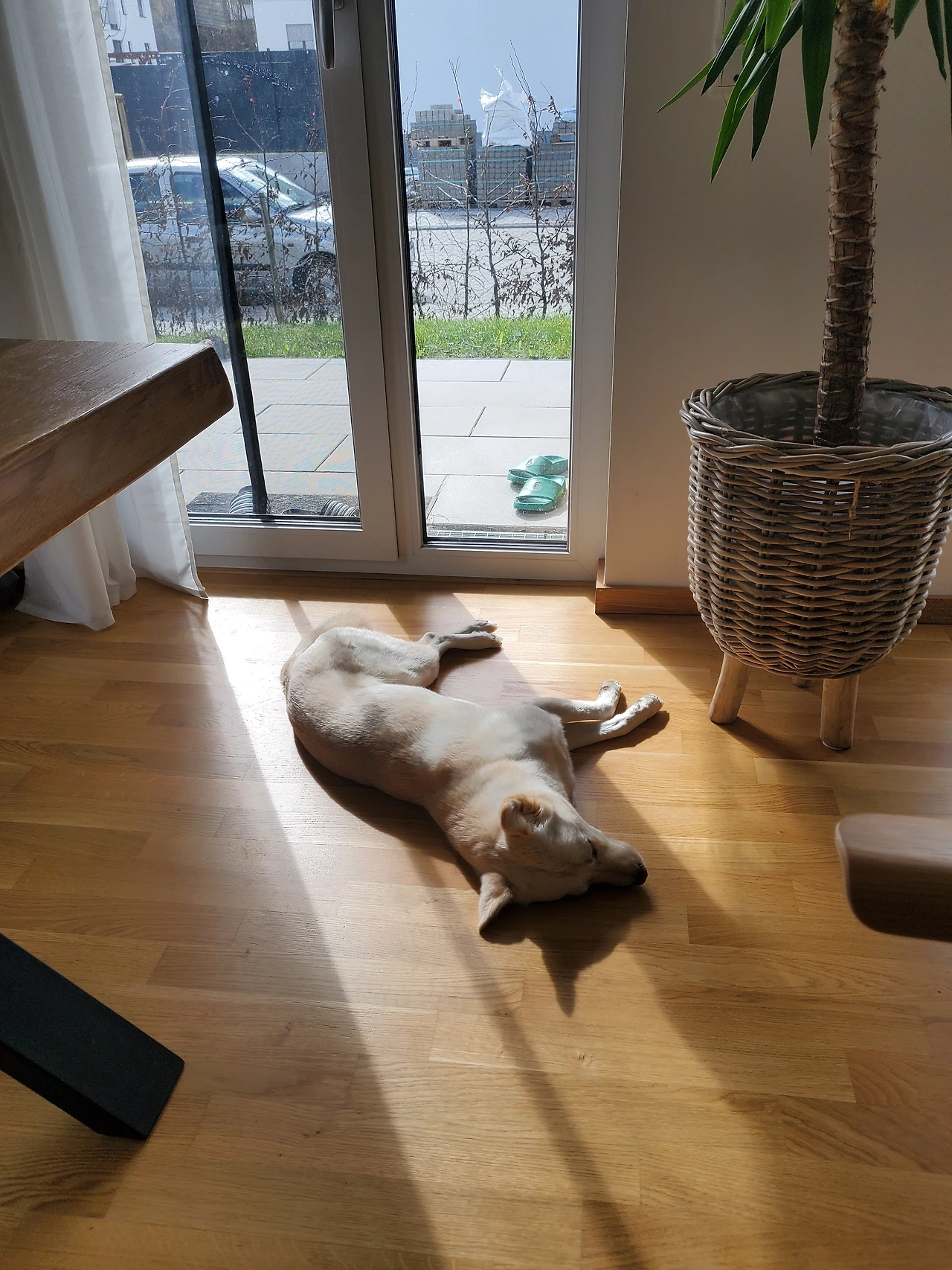 어딘가에서 읽었는데 사람은 대부분 과거에 대하여 85% 정도를, 현재 10%, 미래는 5%만 이야기한다고 한다. 반면 개는 현재에 대해서만 생각한다. 물론 내 개도 어떤 과거의 기억으로 인한 트라우마 같은 건 있다. 예를 들어 누리는 1년 반이 지나 독일에 다시 돌아와서 동물병원 가는 길로 산책을 가는데 개의 꼬리가 애매하게 절반쯤 내려가더니 곧장 가지 않겠다고 줄을 당기고는 그대로 주저앉았다. 그런 것 빼고는 내 개는 지금 이 순간에 온전히 집중한다. 독일에 오랜만에 해가 뜬 날은 작게라도 해가 비추는 자리를 찾아다니며 만족스럽게 누워 낮잠을 자고 산책하고 돌아오면 곧장 작은 정원을 뫼비우스의 띠 모양으로 알차게 달리며 신난 기분을 표출한다. 식사를 마치고 간식까지 충분히 먹고는 작은 한숨을 내쉬고(편안하다는 표현이다) 침대에 동그랗게 누웠다가 어느새 네발을 쭉 뻗은 채 편하게 잠이 든다. 좋은 꿈을 꾸는지 꼬리도 흔들고 다리를 파닥파닥 움직이며 그렇게 하루를 마무리한다.