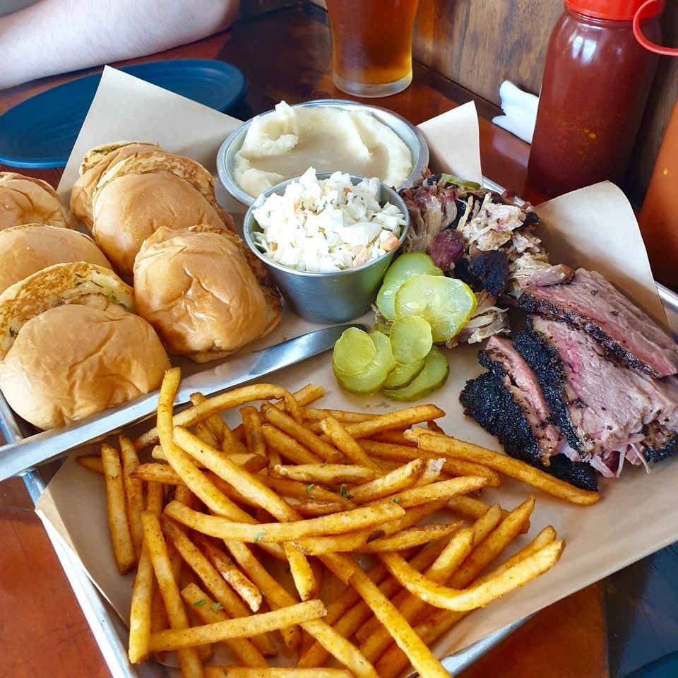 허기를 달래려 애꿎은 라거를 홀짝대는 동안 음식이 나왔습니다. 전형적인 바비큐 2인 플래터. 구성은 브리스킷, 풀드 포크, 버터를 듬뿍 발라 구운 버거 번, 그레이비를 곁들인 매쉬드 포테이토, 감자튀김, 마지막으로 코올슬로입니다. 사실 저는 베이크드 빈즈를 바닥에 깔고 풀드 포크를 듬뿍 넣어 버거를 만들어 먹고 싶었지만 오늘은 혼자 먹는 것이 아니니 과감히 양보했습니다.