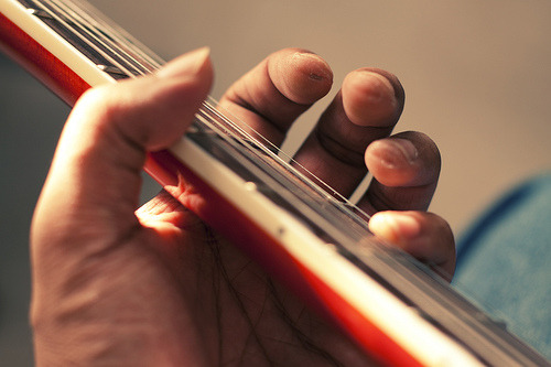 6개의 현 중에서 가장 얇은 줄의 두께는 얼마일까요? 0.3mm입니다. 그렇게 얇은 금속 소재의 줄을 손가락 끝으로 꽉 누르고 있다고 생각해보세요. 처음에는 정말 정말 아픕니다. 말 그대로 철사가 손에 파고드는 느낌이에요(실제로 그렇기도 하구요). 그 고통을 최소 열흘에서 넉넉잡고 한 달 정도는 그냥 참아야 합니다. 다른 방법이 없어요. 계속 치다 보면 굳은살이 배겨서 언제 그랬냐는 듯 고통이 싹 사라집니다. 그리고 단단해진 손가락 끝을 만지다 보면 일종의 훈장처럼 여겨져 기분이 좋아지기도 합니다. 하지만 즐겁자고 취미활동하는 건데, 이런 물리적인 고통을 감내하기가 쉽지 않죠. 여기서 탈락하시는 분들도 상당수입니다.