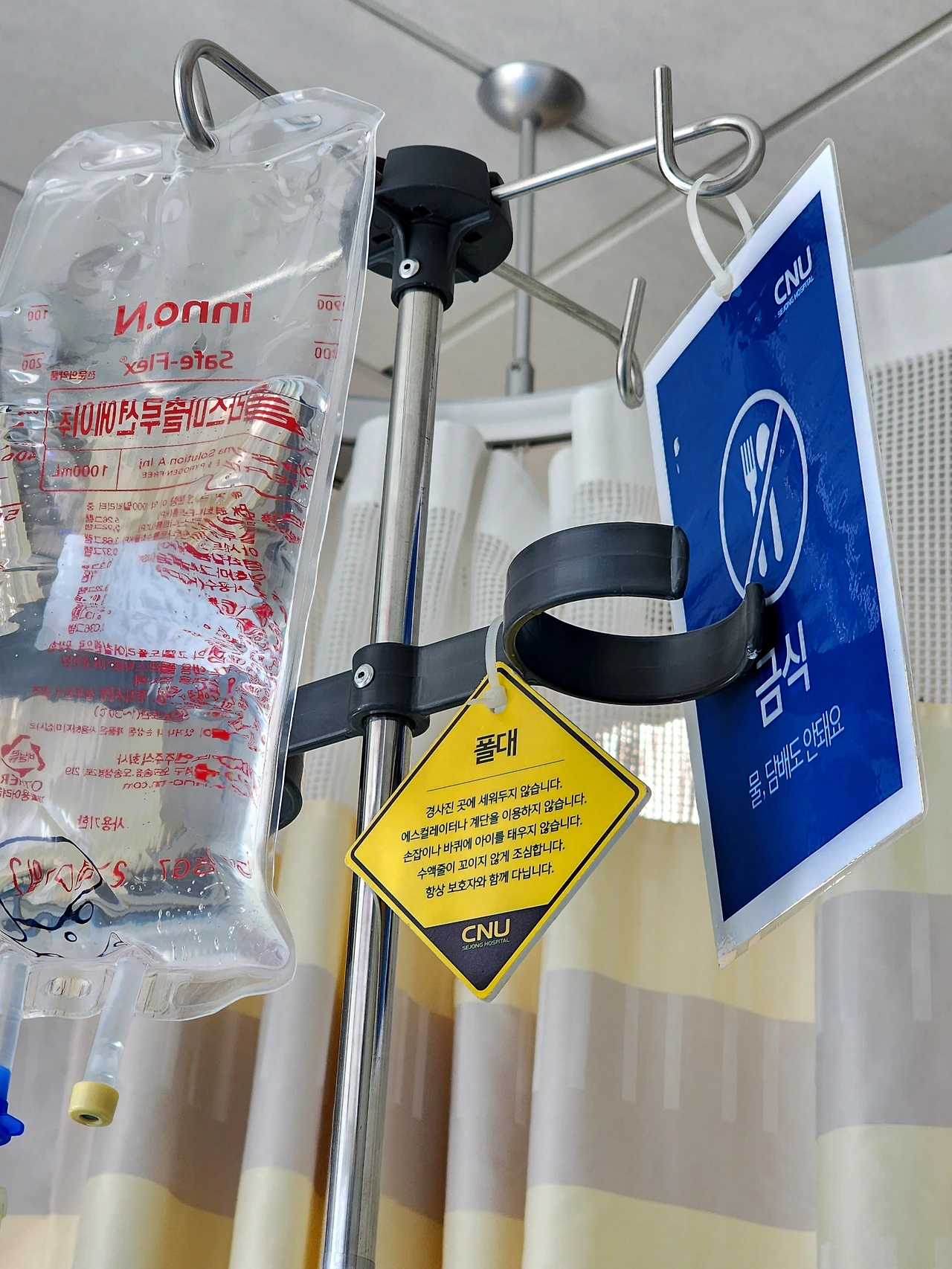 병실을 배정받고 입원 절차를 밟았다. 입원 안내를 받으며 한 가지 절망적인 통보를 듣게 되었다. 물을 포함한 모든 음식의 금식. 나중에는 이해가 되었지만, 처음 들었을 때는 청천벽력이었다. 물도 마시지 못한다니... 장이 막혀있어 음식물이 들어가면 계속 통과가 되지 않으니 음식물 섭취를 제한하는 것이었다. 대신, 영양소를 계속 공급해 주는 수액을 투여한다. 그래서인지 신기하게도 배가 고프지는 않다. 다만 물을 입으로 섭취하지 못하다 보니 입이 계속 마르고 목으로 물을 넘기고 싶다는 생각을 자꾸 하게 된다.