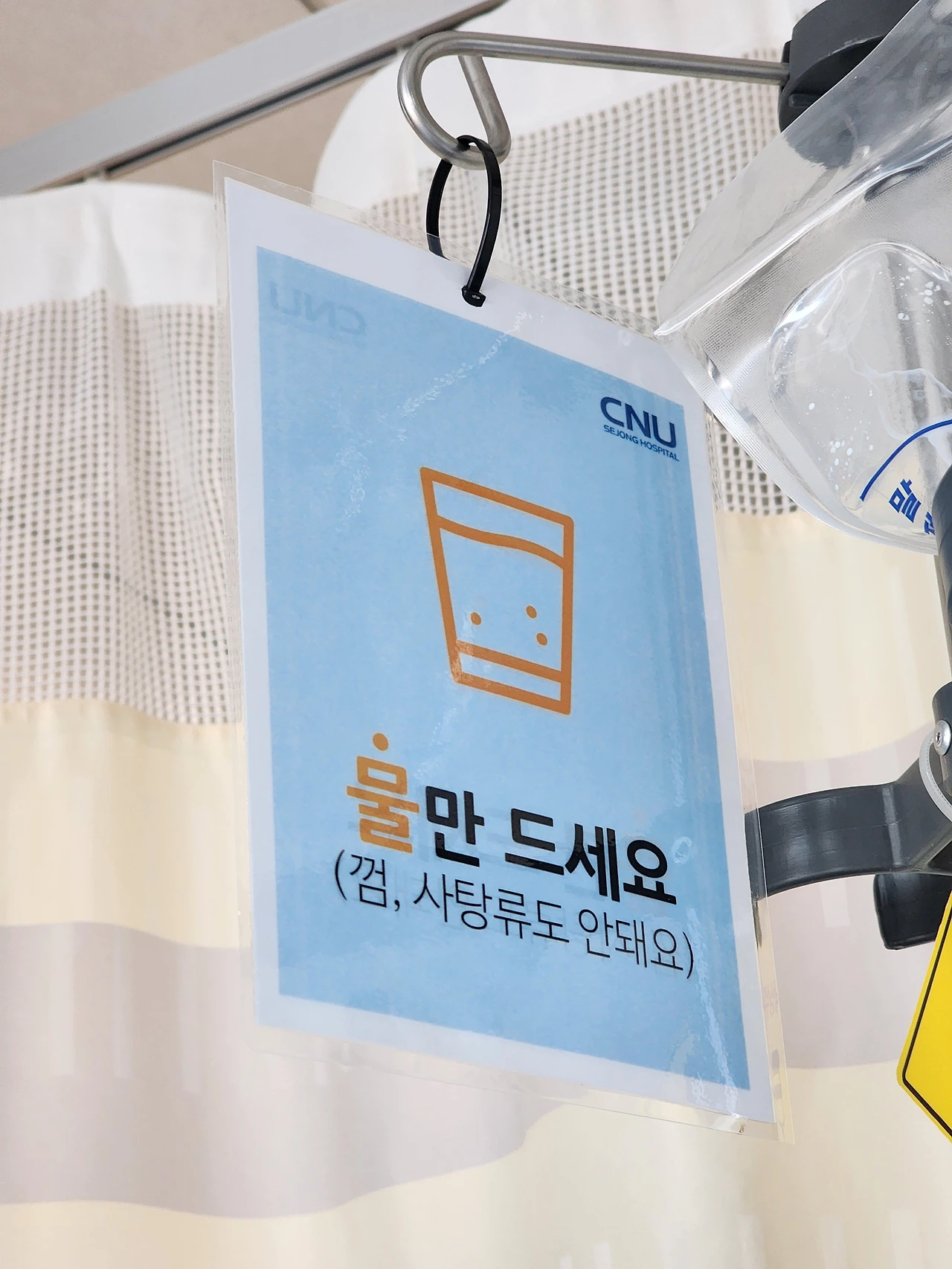 X-ray 촬영을 마치고 올라와 걷기 시작했다. 두 번의 새벽 기상으로 잠이 다 깨버린 탓에 누워있기보다 걷기를 선택한 것이다. 천천히 걷다가 담당 간호사님을 마주쳤다. 상태를 물으셔서 무엇보다 목이 마르다고 답했다. 어제부터의 소변 대변 이력을 살펴보시더니 물을 마셔도 되는지 담당의에게 확인해 보겠다고 하셨다. 남은 바퀴수를 마저 걷고 병실로 돌아오니 간호사님이 새로운 금식 팻말을 가지고 오셨다. 바로, 물을 마셔도 된다는 팻말이었다!