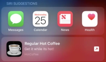 사용자가 수행하지 않았던 앱 특화된 액션이라고 할 수 있으며, 장소와 하루 중 시간과 같은 관련 정보를 포함한다. 이 단축어는 애플워치 페이스(홈화면)에 적절한 시간과 장소를 고려해 알아서 노출되는 것이 핵심이다. 직접 앱에 시리 단축어 추가를 유도하고 싶다면, Suggested Shortcut을 활용하면 된다.