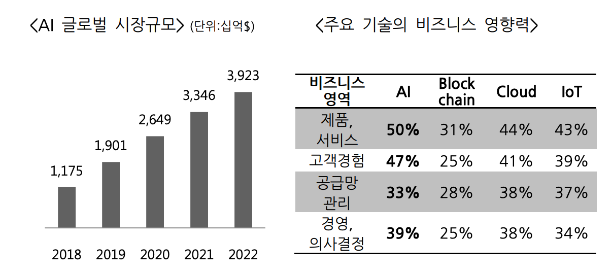 뿐만 아니라, 포스코 경영연구원의 보고서에 따르면 AI 시장규모는 2022년 $3.9조에 이를 것이며, 모든 산업군에서 가장 큰 비즈니스 영향력을 가질 것으로 보여진다고 한다. (AI> 클라우드 > IoT > 블록체인 순)