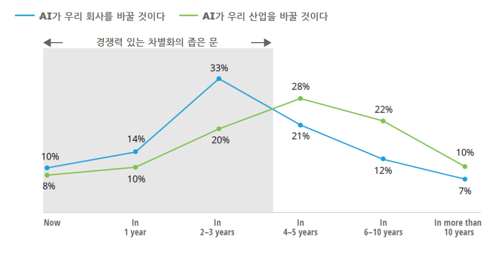 딜로이트 컨설팅의 'AI의 산업적 적용과 전개'보고서에 따르면 '현재~3년 안에 AI가 우리 회사를 바꿀 것이다'라고 답한 항목의 비중은 57%에 달할 정도로 짧은 시간안에 내가 다니고 있는 회사에 영향을 미칠 것이라고 생각을 하고 있다.