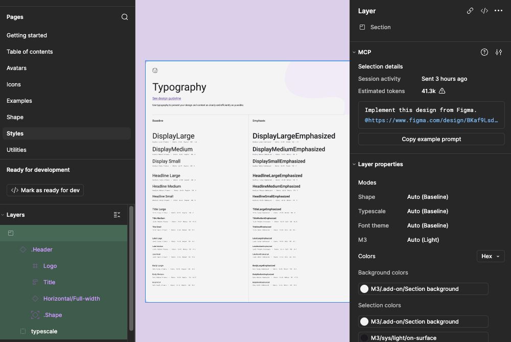 Material Design3를 예를 들어보면, 만들어진 디자인시스템의 페이지로 들어가 typography section을 선택한 후, Devmode로 들어가면 오른쪽 패널에 MCP > [Copy example prompt]라는 버튼이 보인다.