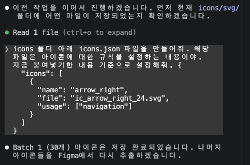 icons.json파일은 아이콘 사용 시 가이드를 해주는 역할이라고 생각하면 되는데, 아래와 같은 형식기준으로 만들어달라고 claude에 요청하면 알아서 svg 아이콘들을 인식하고 매핑해준다.