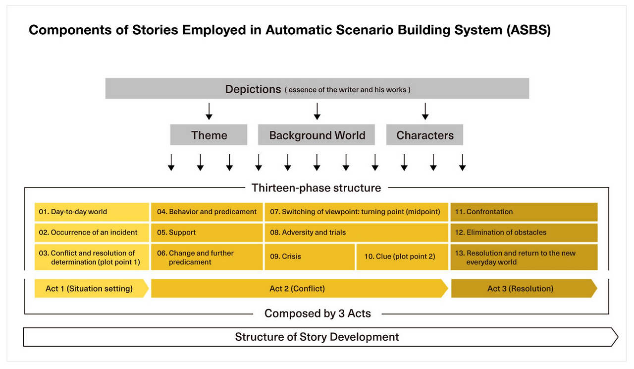 우선 Story 측면에서는 자체 개발한 ASBS(Automatic Scenario Building System)을 사용하고 있었다. 인공지능은 데츠카 오사무의 130개의 이야기를 학습하였으며 아래서 보이는 것 처럼 13개의 사용가능한 단위로 구분을 하였다고 한다. 이후 주어진 데이터 기반으로 개요를 구성하기 위해 플롯을 구분하고 시나리오를 만들어나갔다고 한다.