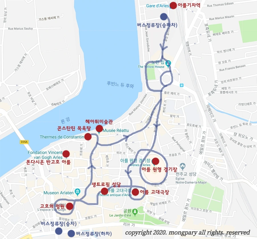 나는 북측의 최종 정류장에 내려 쭉 내려오면서 <아를>을 봤지만