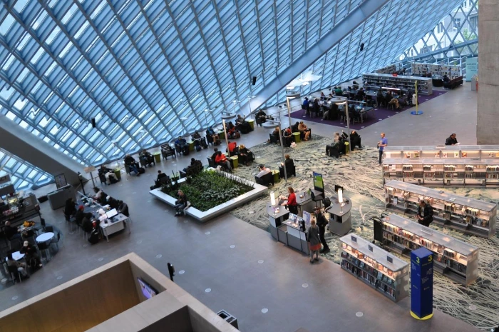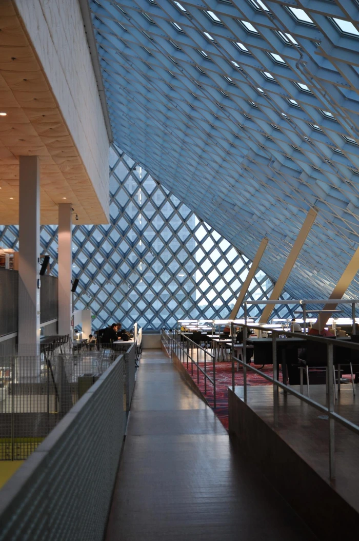뻥 뚫려 있는 보이드가 굉장히 압도적인 공간에 안내센터, 샵, 서가, 책읽는 공간들이 자유롭게 놓여져 있었고 사람들이 여유롭게 그 공간을 즐기고 있었다.