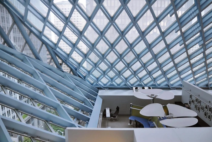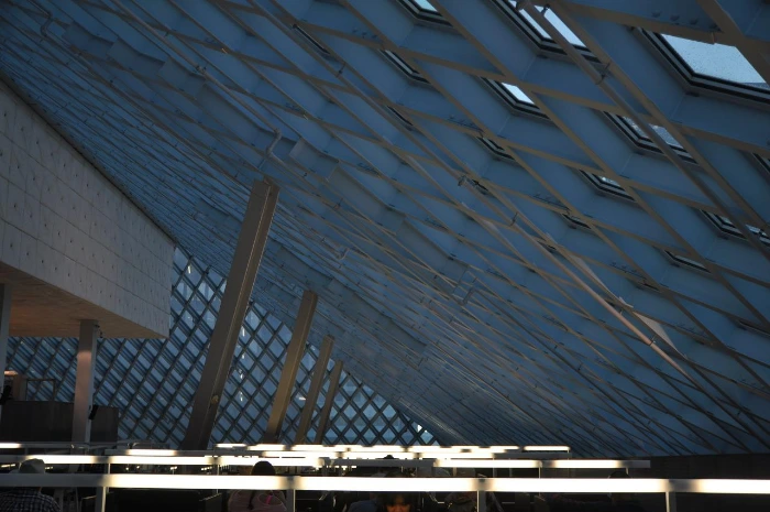 *처음에 이 커튼월을 보았을 때 엄청난 멀리언의 사이즈에 깜짝 놀랐는데 자세히 보니 I형강이어서 더 놀랐다. 이 형강들이 경사면/ 역경사면/ 수직면 모두에 대응하기 위해 다이아몬드 모양으로 배열되어 있고 이 형강들은 커튼월 하중을 지지할 뿐 아니라 내진구조역할도 하고 있다고 한다. 너무나 오묘한 빛으로 나를 매료시켰던 유리는 바깥쪽에 두개의 유리층+공기층+안쪽 유리층으로 구성되어 있는데 바깥유리의 중간층에 알루미늄 금속 메쉬망이 들어가 있다. 이 금속 메쉬의 패턴이 멀리언과 같이 다이아몬드 모양의 패턴이어서 직사광선을 적절히 차단하면서도 조망은 충분히 가능하게 했다고 한다. 그리고 가장 바깥면의 유리는 저철분유리를 사용하여 맑은 빛이 들어올 수 있도록 계획되었다고 한다.