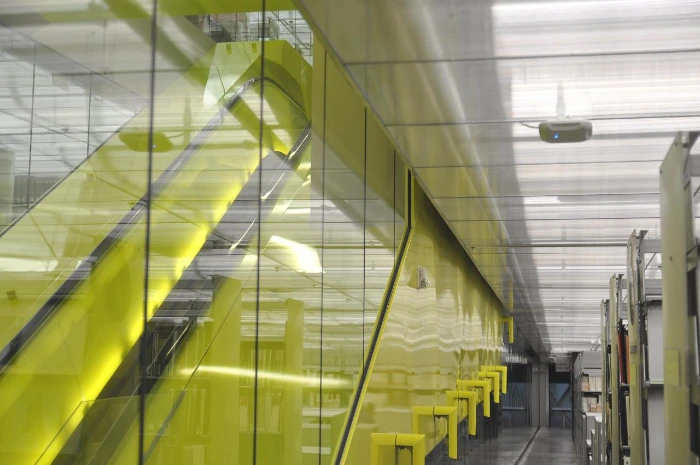 경사진 커튼월과 보이드가 만들어 낸 독특한 느낌의 공간들은 설계자가 의도한 불확정적인 공간이었고