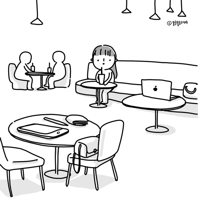 한국 까페에 노트북을 올려놓고