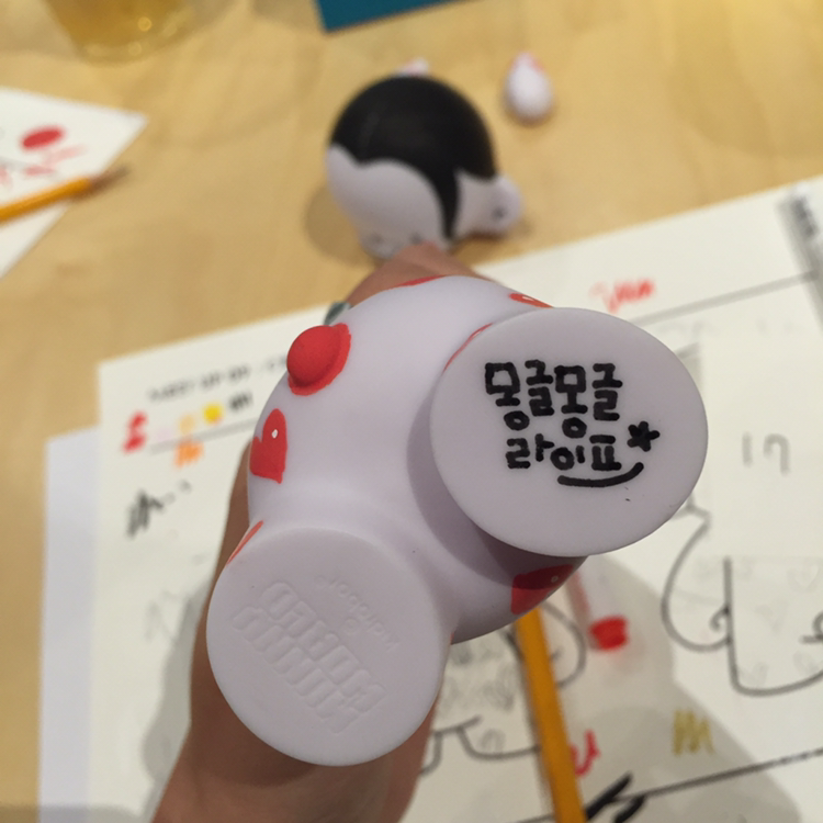 각 자리에는 이렇게 MUMMY 한 개, 스케치할 종이 한 장, 연필, 마커 한자루씩 세팅되어 있고요, 컬러마커는 공용으로 사용할 수 있도록 테이블 중앙에 배치 되어 있었어요.