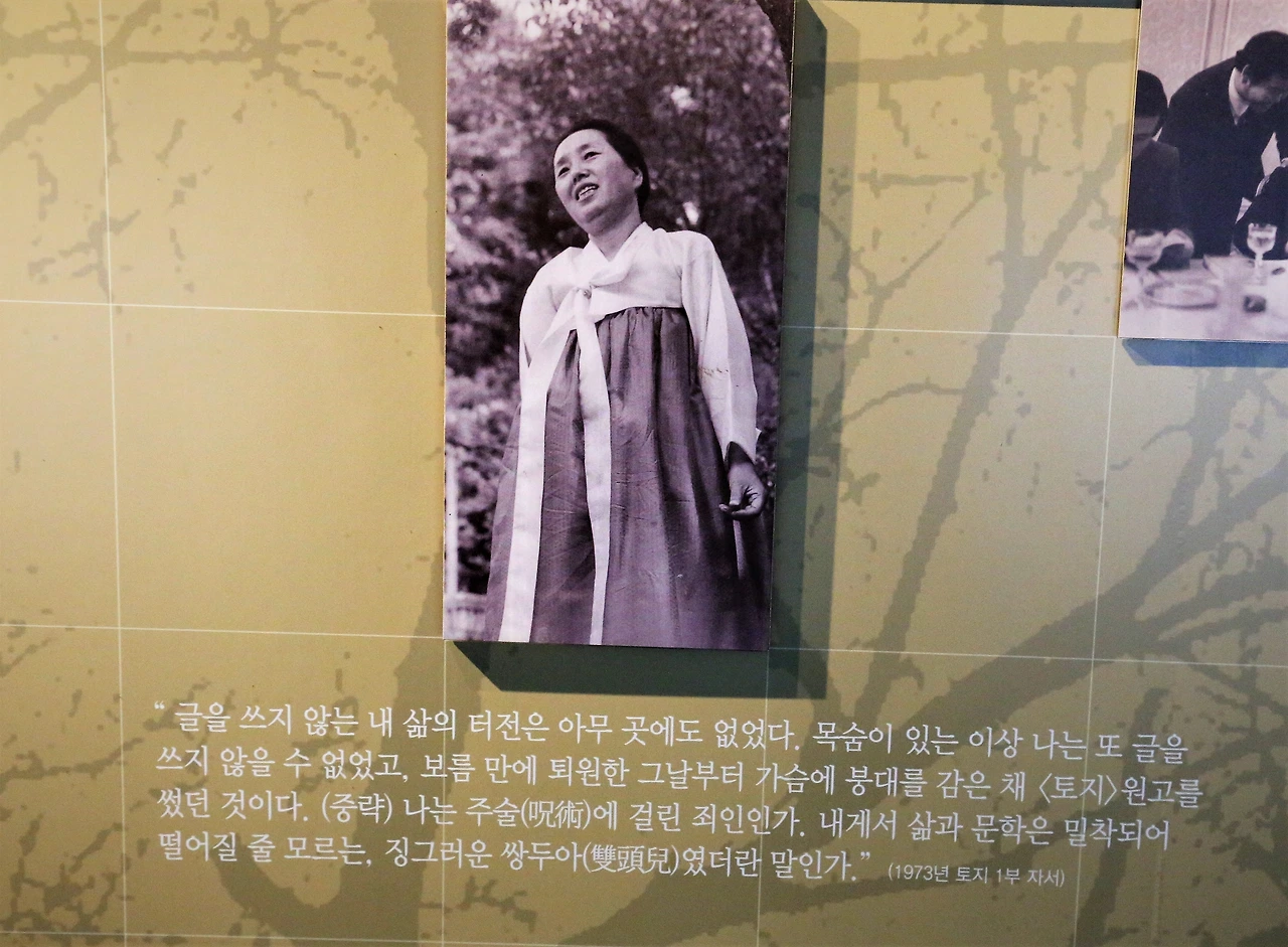 전시관을 천천히 걸으며 그녀의 삶을 되짚다 언젠가 읽은 어느 신문기자의 글이 떠올랐다. '해질녁 찬바람이 몰아치는 서대문 형무소 높은 돌담 아래 한 여인네가 아기를 들쳐업고 서성이고 있었다. 김지하 시인이 오늘 석방된다는 소식에 취재를 위해 차 안에서 기다리는 중이었다. 누굴까 저 여인네는.. 생각하다 박경리 작가임을 알게 되었다." 겨울 저녁 매서운 바람을 맞으며 손주를 들쳐업고 사위 김지하의 석방을 기다리던 그녀의 모습이 아픈 장면이 되어 가슴으로 박혔다. 딸의 삶도 안고 가야 했던 그녀의 심정을 감히 짐작해 본다.