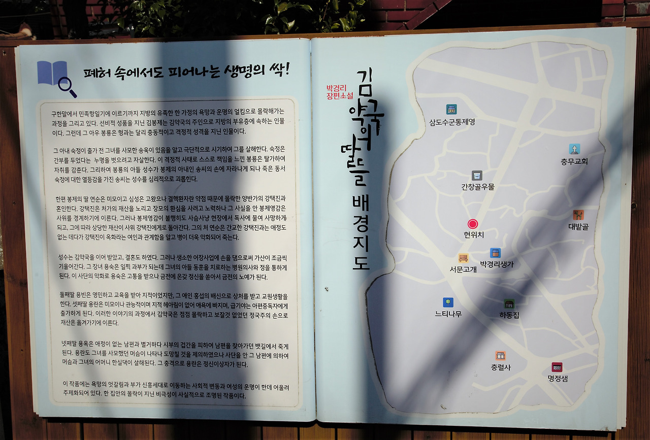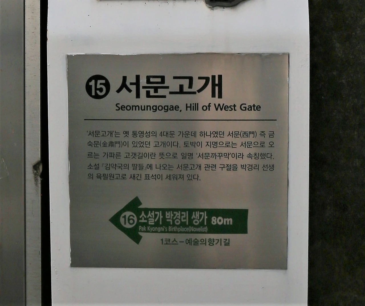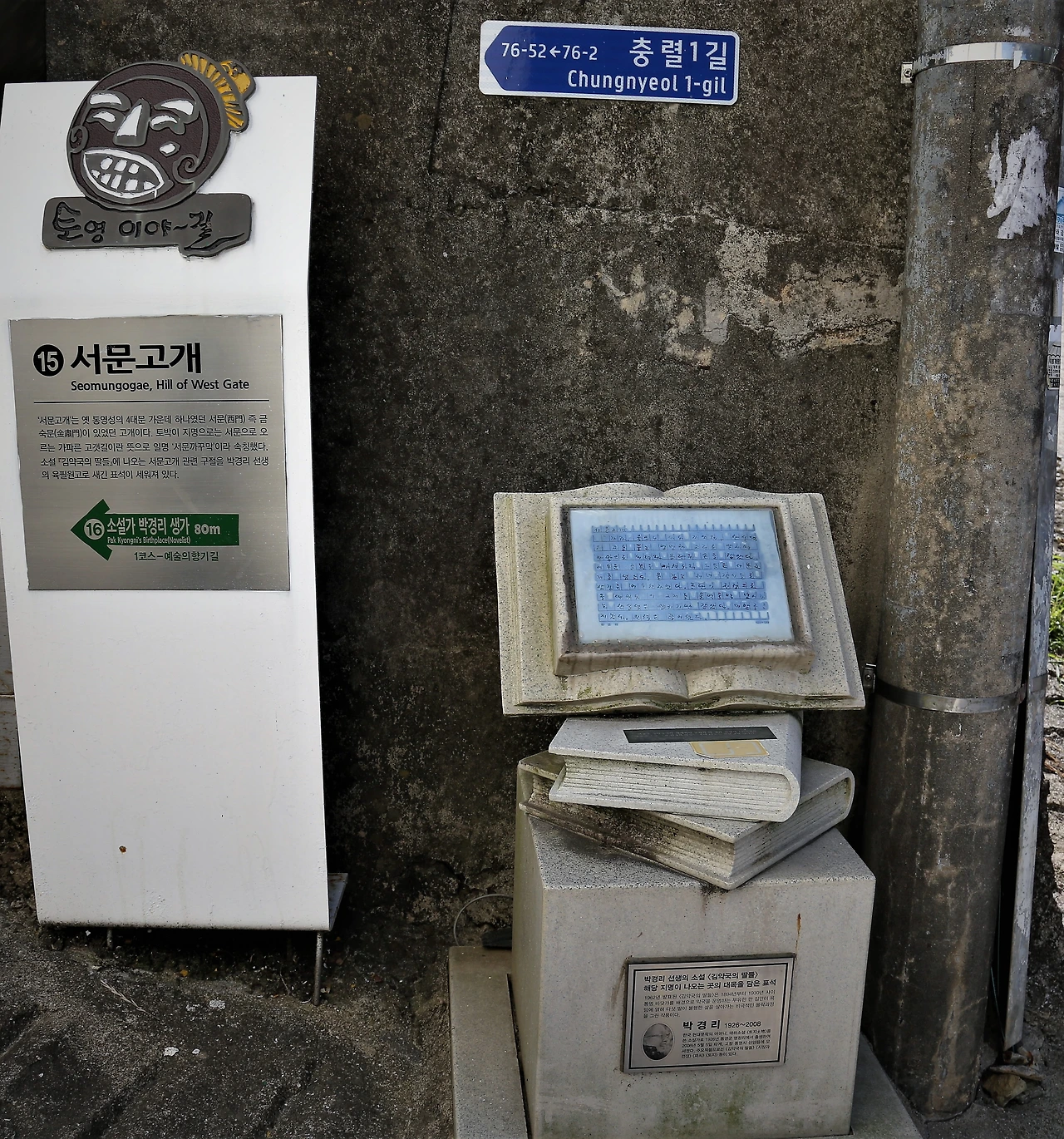 서문고개 오르는 길 오른편에 '김약국의 딸들 배경이 된 마을'이란 설명이 나온다. 학창시절, 한 가정이 저주를 받은 듯 몰락해가는 그 작품을 읽을 땐 여느 서스팬스 소설에 버금가는 오싹한 한기를 느꼈었다. 운명은 스스로 개척하는 것이라 여겼는데 이 작품을 읽고는 인간은 운명을 거스르기 힘든 존재인가 하는 의문이 일었었다. 인간의 의지를 넘어서는 운명이 가슴 아팠다. 작품에 나오던 서문고개, 명정샘, 대밭골, 충렬사, 하동집과 느티나무란 이름이 반가웠다. 서문고개에 오르니 소설 속 이야기가 아니라 실제 있었던 일처럼 여겨져 김약국의 동네 구석구석을 돌아보는 마음이 아렸다.