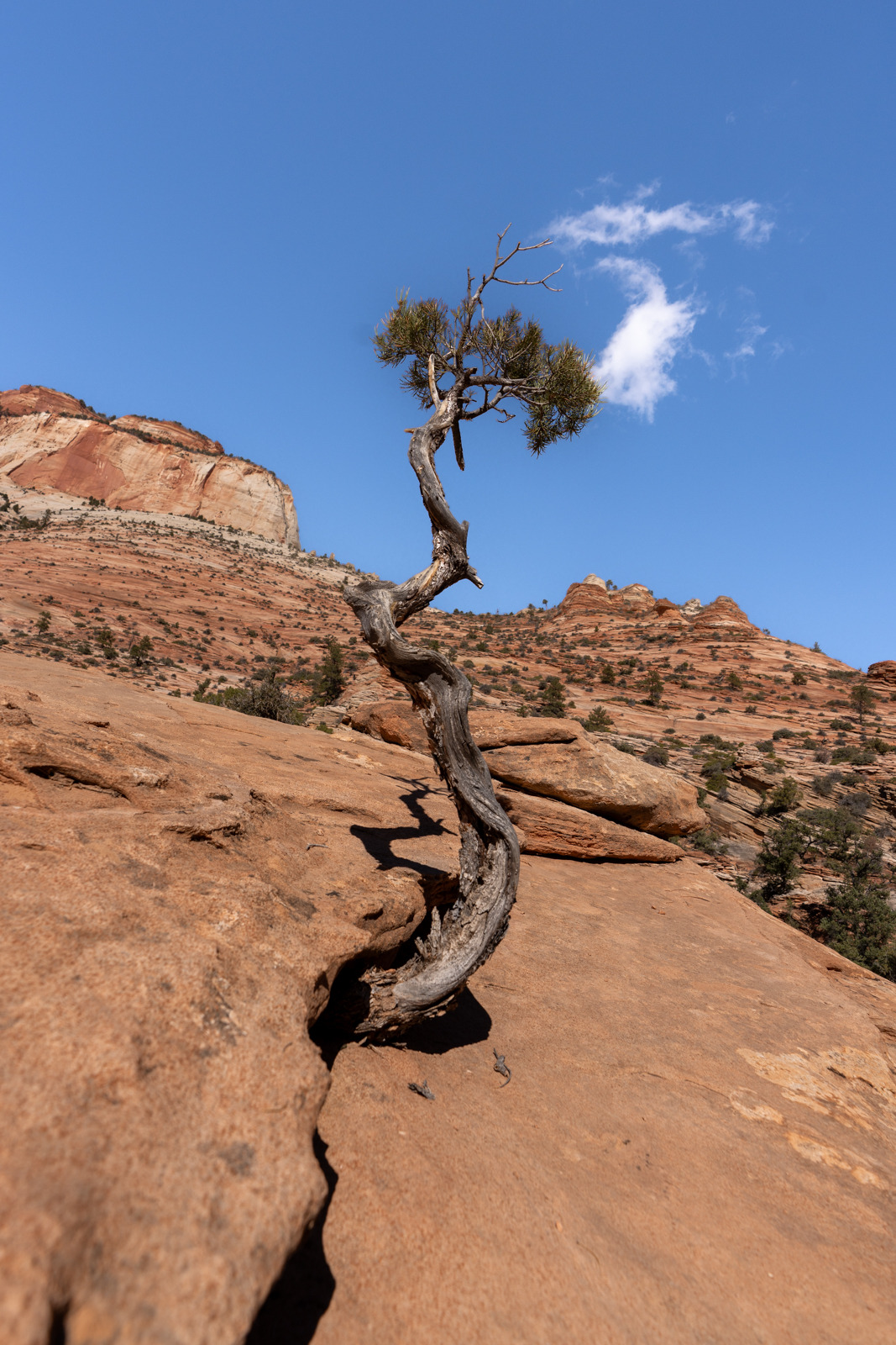 바위언덕을 넘어서 오버룩 정상에 이르자 아래로 광대하게 펼쳐지는 자이언 계곡이 한눈에 들어왔다. 치솟은 높이만큼이나 깊어진 계곡, 서로 이웃하던 바위가 하늘과 땅으로 멀어지며 그리워도 이젠 손 닿기 어려운 위치에 있었다. 바위에 근근이 뿌리를 대고 하늘로 팔을 펼친 나무들, 약속의 땅 자이언을 향하며 기도하던 모세를 닮았다.