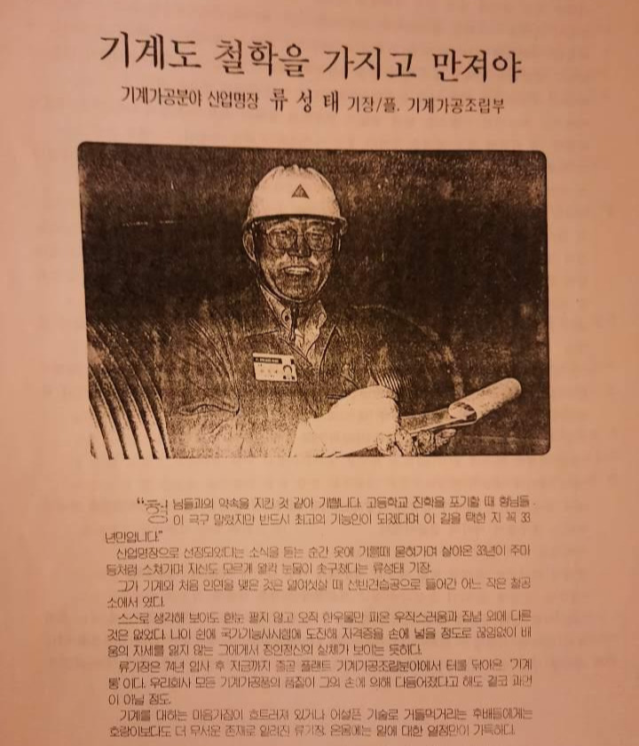 자그마한 철공소에서 현대 중공업 기장이 되고 대한민국 산업 명장이 되기까지 기름 때 묻혀 가며 오직 기계와 함께 해온 성태 삼촌의 33년의 세월. 우직하게 한길을 달려온 그 세월동안 성태 삼촌은 배움의 끈을 놓치게 하고 싶지 않았던 형님과, 아들조차 알아보지 못하던 어머니와의 무언의 약속을 지켜내고 싶었던 거였으리라. 할머니가 살아계셨다면 오늘 같은 셋째 아들의 경사에 “아이고, 시상에서 참말로 자랑시런 내 아들, 우리 성태가 대한민국 명장이 됐다카네. 내 새끼 진짜 장하데이.” 덩실덩실 어깨를 들썩이며 한 바탕 신명 나게 춤추셨을 텐데.