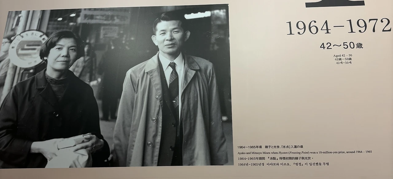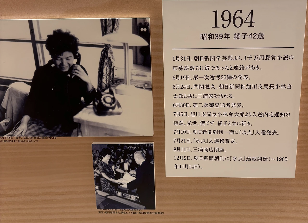 '빙점'은 1964년 아사히 신문사가 주최한 창간 85주년 기념 현상 소설 공모전에 당선되며 그녀를 유명작가로 만든 작품이다. 당시 일본 전역에 센세이션을 불러일으킬 만큼 인기가 있었다고 한다. 우리나라에서도 드라마로 각색되어 인기리에 방영되기도 했다.