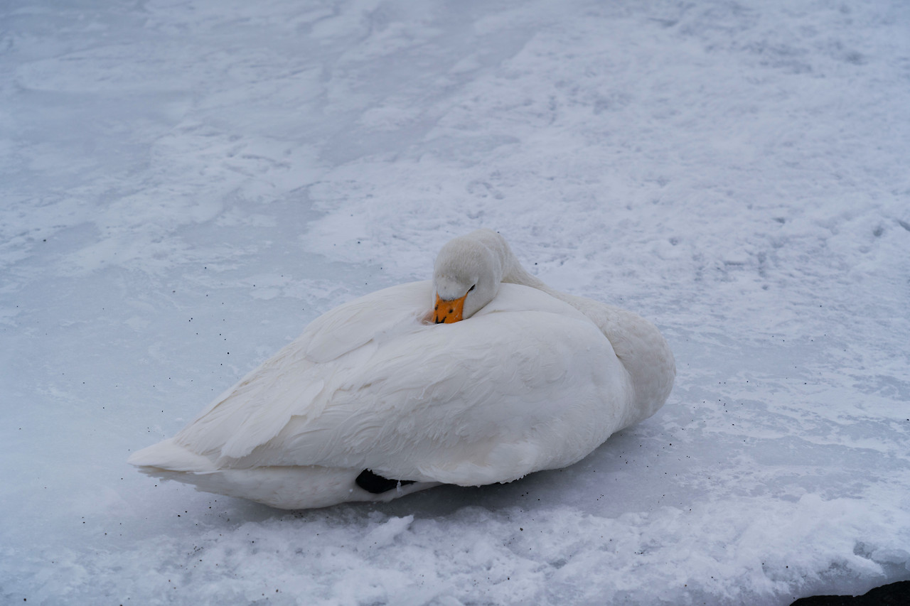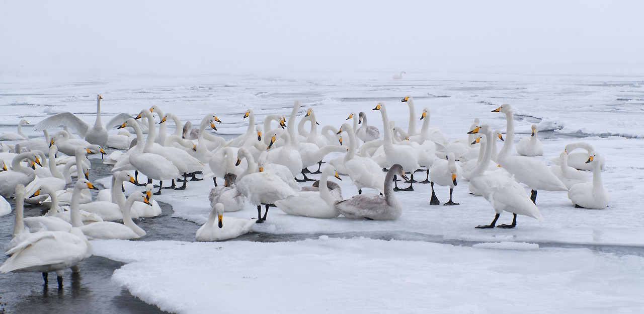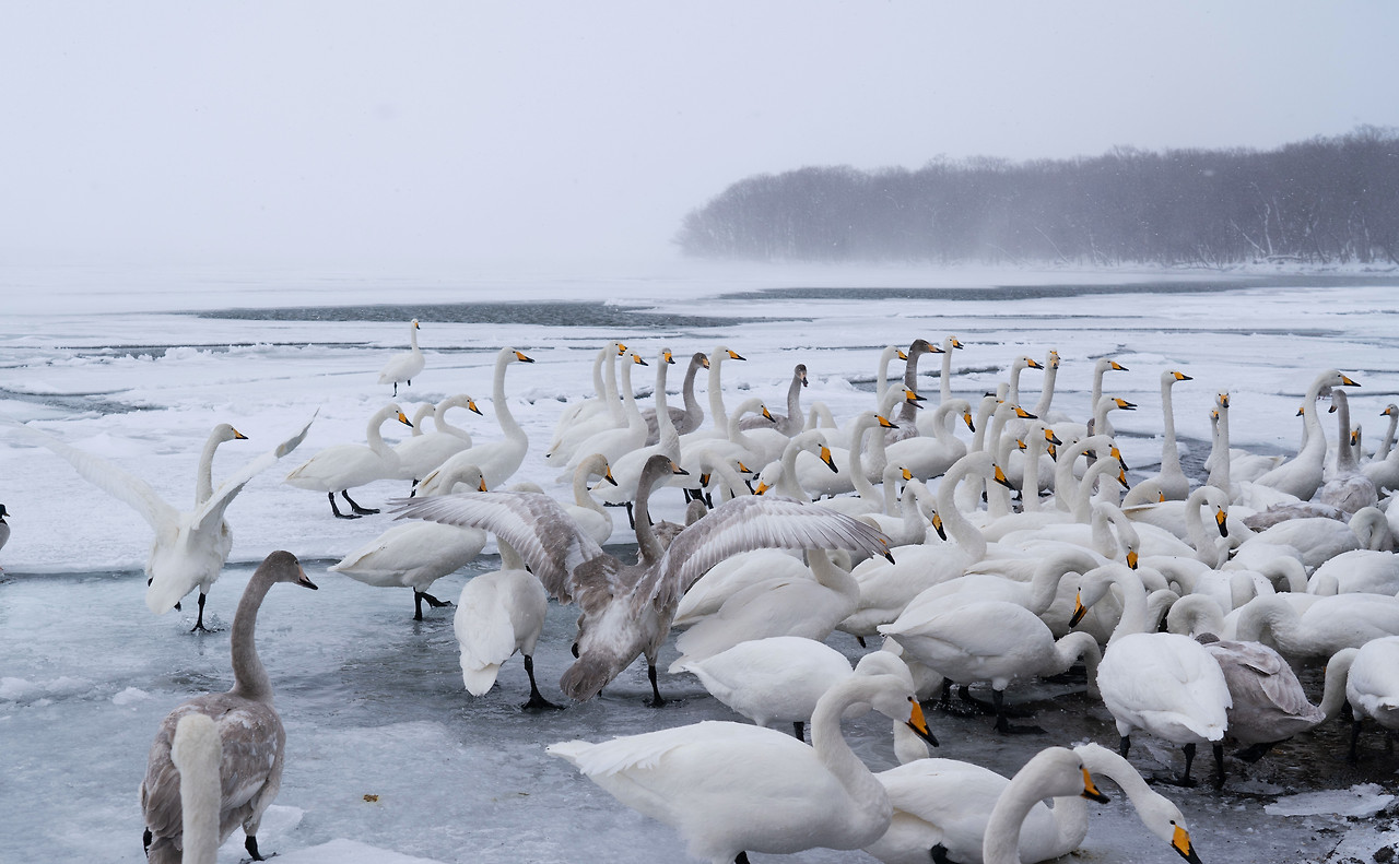 호텔서 30분 거리의 쿠샤로 호수는 어제보다 추위가 더 맹렬했다. 눈보라와 추위에 호수의 빙판은 점점 불어나 백조가 떠다닐 공간을 잠식하고 있었다. 그나마 호수 언저리 실오라기 같이 남은 물 위에 백조들이 빽빽이 모여 있다. 겨울바람은 그 실낱 같은 희망마저 모두 얼려버릴 기세다. 이런 혹한 속에 밤을 지새우다니. 백조는 이따금 호수 끝자락까지 이어지는 빙판 위로 날아올랐다가 이내 물가를 찾아 머리를 날갯죽지에 넣고 웅크렸다. 서로 끌어안고 체온을 나누면 좋으련만 삶은 결국 스스로 이겨내는 것임을 아는 건지 제각기의 방법으로 겨울을 버텨내고 있다. 아직도 멀게 남은 겨울을 살아내야 한다. 그들의 겨울나기의 무게가 느껴져 발길 돌리는 마음이 무거웠다.