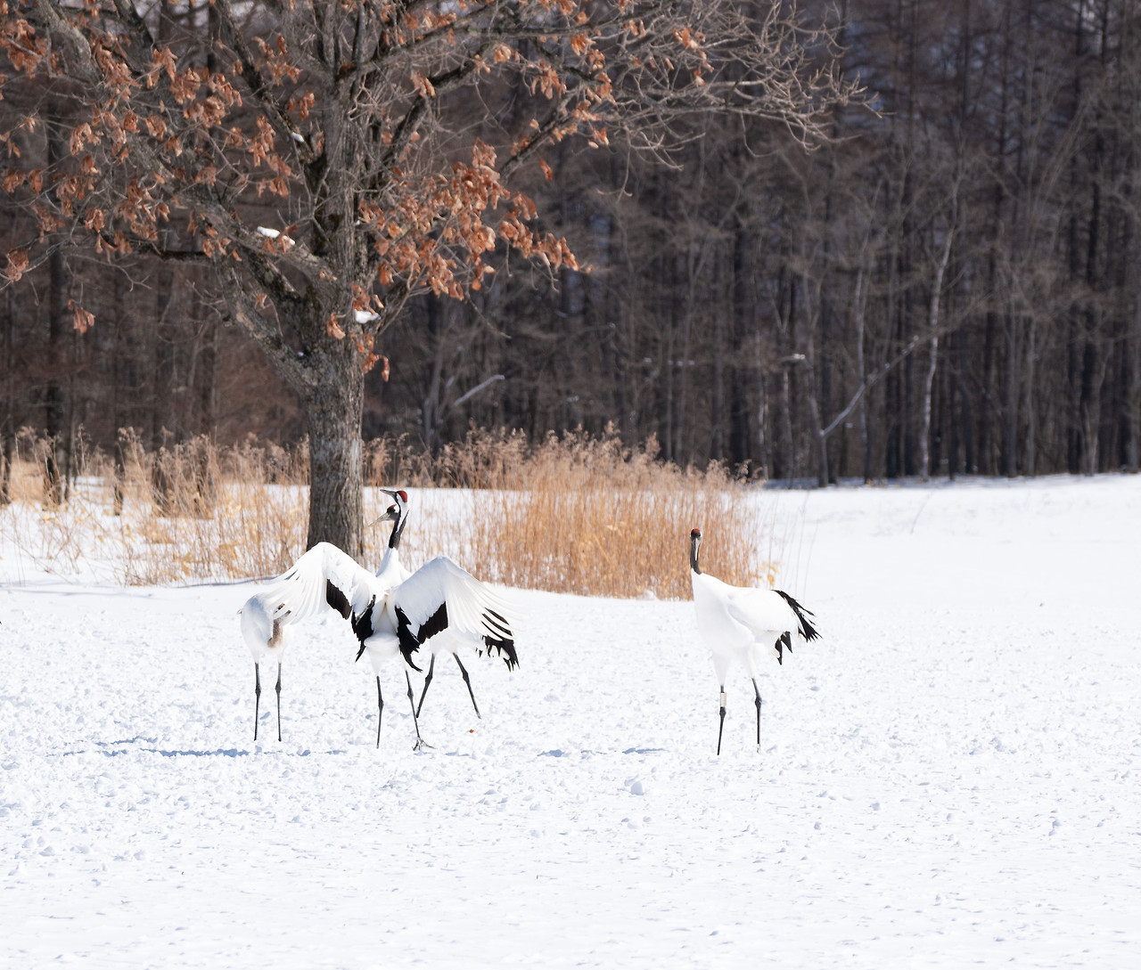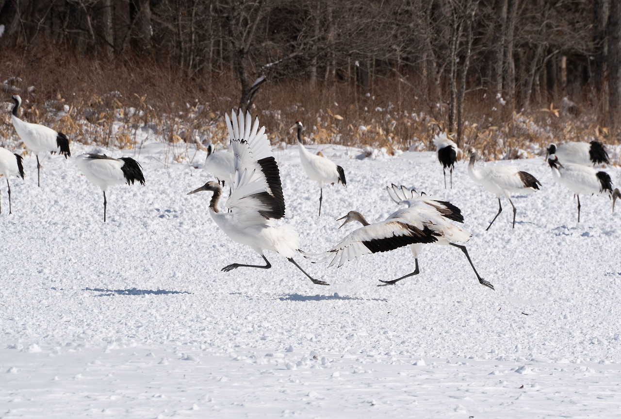 산을 넘어서자 언제 그랬냐는 듯 날씨가 맑아졌다. 산을 경계로 날씨가 판이하게 달랐다. 학농장엔 오늘도 많은 사진가들이 몰려있었다. 먹이 주는 시간 전에 도착해야 날아오는 학들을 찍을 수 있는데 오늘도 한발 늦었다. 눈보라가 잦아들어 사진 촬영에는 편했지만 학들의 사랑춤을 볼 수는 없었다. 밤새 얼었던 몸을 녹이기라도 하듯 가만가만 햇살을 따라 걸으며 식사 시간을 기다리고 있었다. 사랑도 식후경인가 보다.