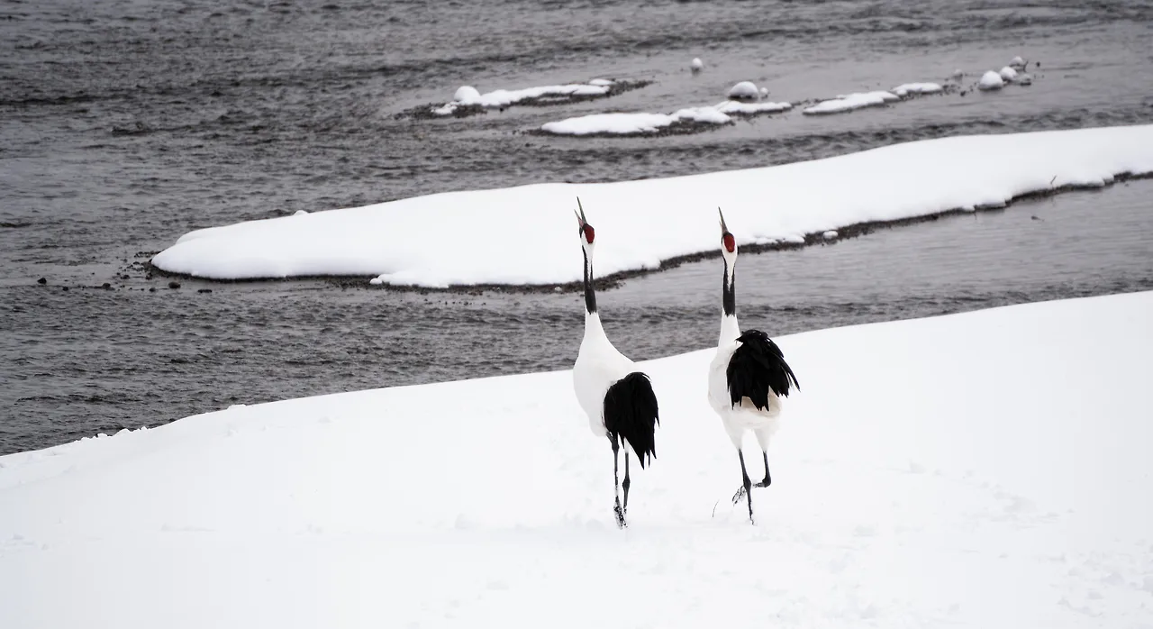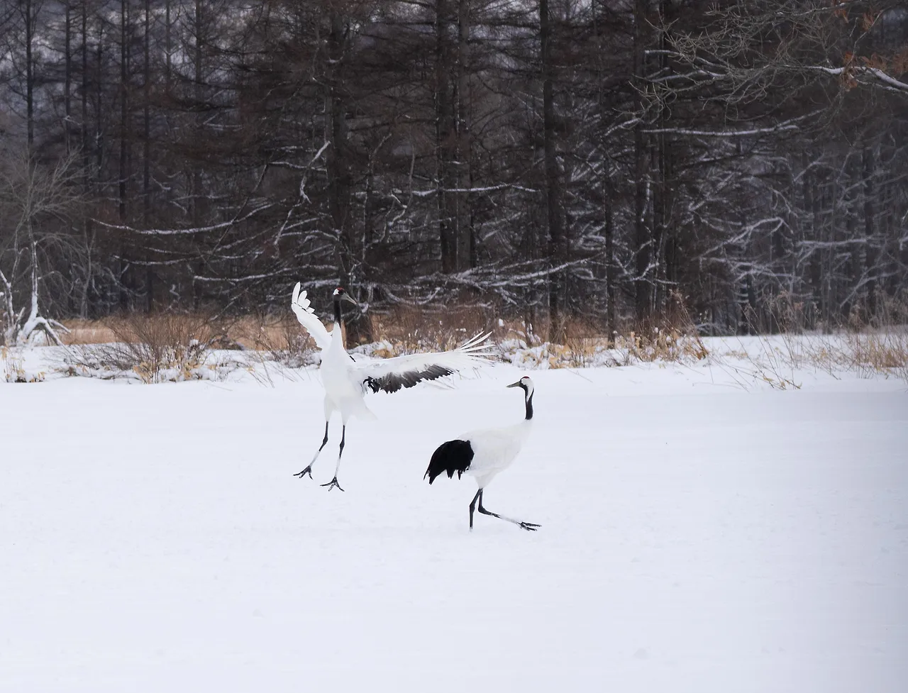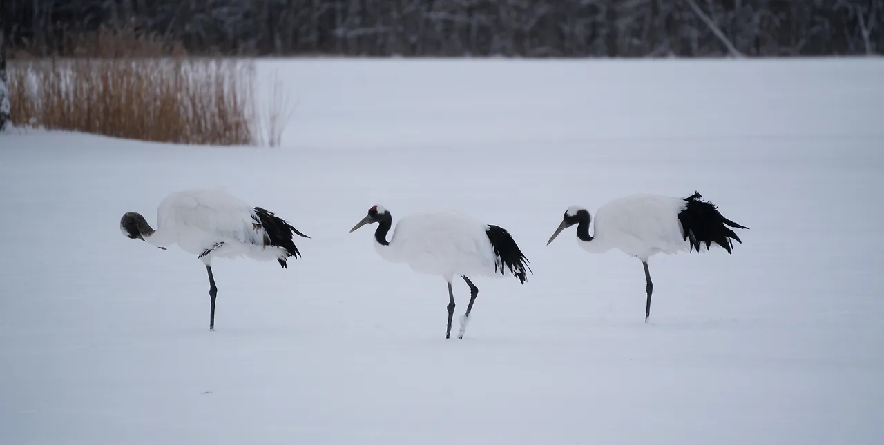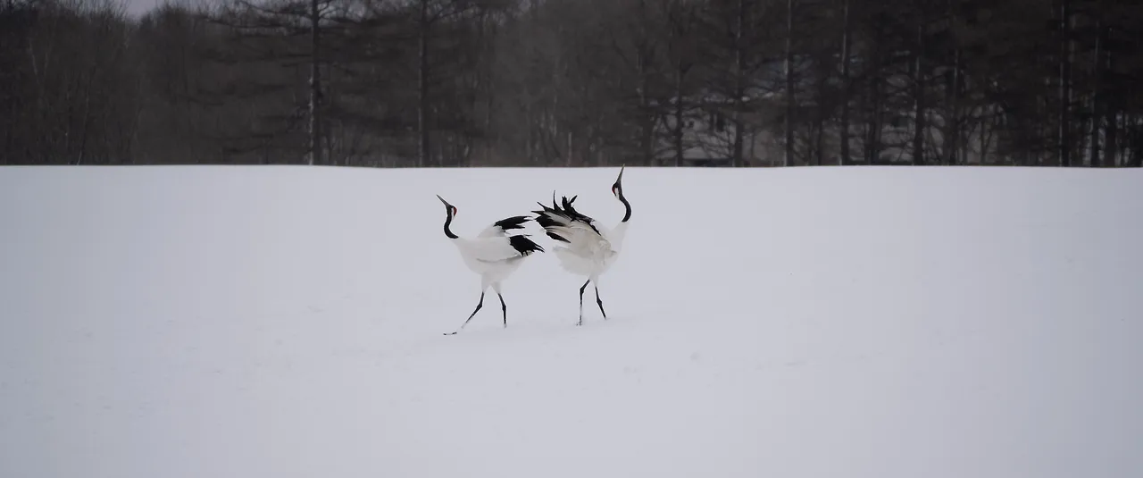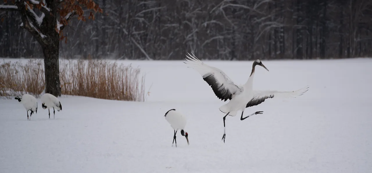 학(鶴)은 두루미과의 한 종으로, 한국 철원에서도 관찰할 수 있는 겨울 철새이다. 홋카이도 동부는 흰 깃털에 머리에 빨간 왕관을 쓴 단정학 (丹頂鶴, Red-crowned crane)이 많은데 일본에서는 탄조(Tancho)라 부른다. 겨울을 이곳에서 보내기 위해 시베리아에서 날아온다. 키가 1미터 40센티미터고 날개를 펼치면 2미터 40센티미터가 되는 거구다. 목과 다리가 길며 우아하고 기품이 있다. 30년에서 50년을 사는 장수동물로 일부일처제라 한다. 감정표현을 잘하며 서로 짝을 이루면 끝없이 애정 표현을 한다. 번식기의 수컷은 화려한 춤으로 구애를 한다. 수컷은 콩, 암컷은 꼬깍하며 반응하는데 새의 언어로 '사랑해요' 란 뜻이란다. 학들은 식사가 끝나면 구애춤(Courtship dance)을 춘다. 이 춤은 적수로부터 애인을 방어하고 짝과의 관계를 돈독하게 한다. 서로의 애정을 재확인하는 몸짓이라 한다.
